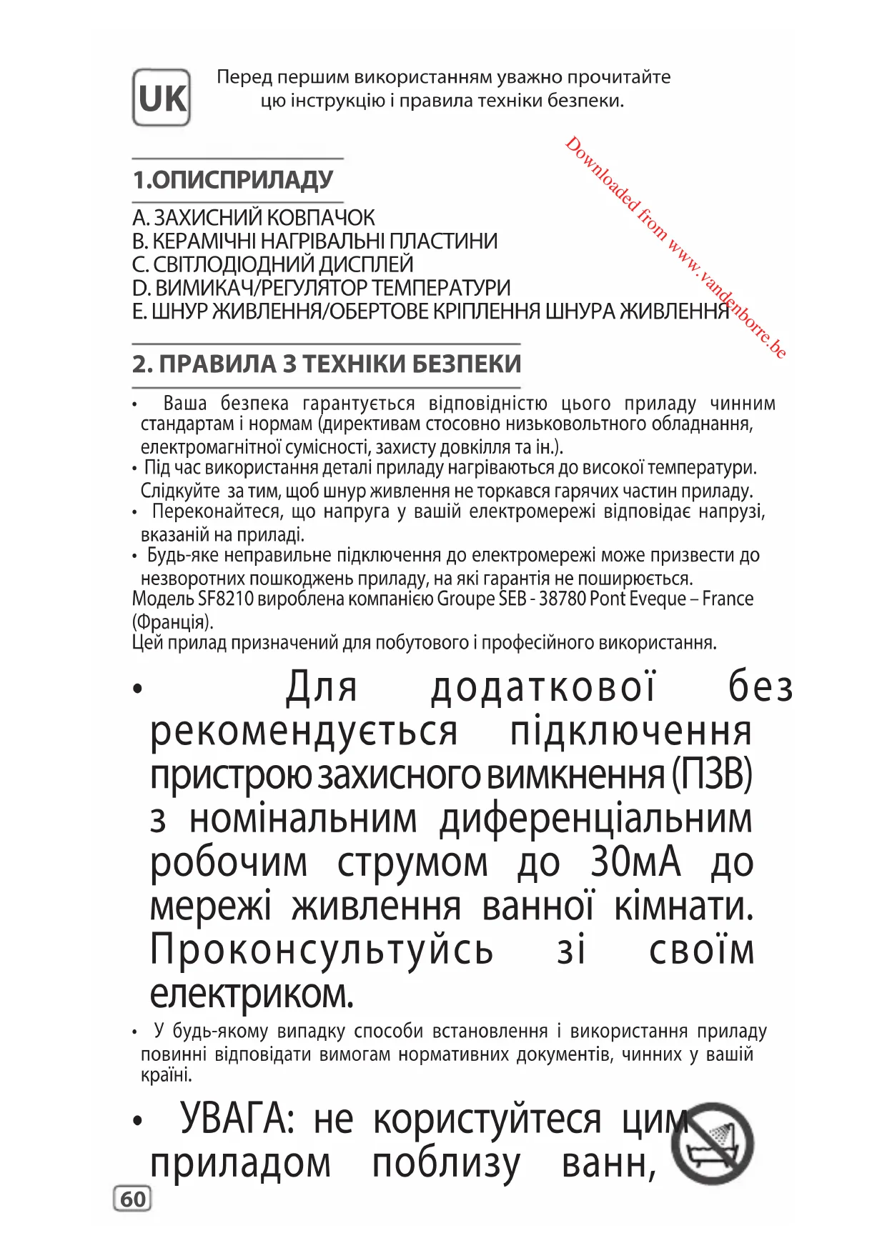 - Ваша безпека гарантується відповідністю цього приладу чинним стандартам і нормам (директивам стосовно низьковольтного обладнання, електромагнітної сумісності, захисту довкілля та ін.).• Під час використання деталі приладу нагріваються до високої температури. Слідкуйте за тим, щоб шнур живлення не торкався гарячих частин приладу.• Переконайтеся, що напруга у вашій електромережі відповідає напрузі, вказаній на приладі. • Будь-яке неправильне підключення до електромережі може призвести до незворотних пошкоджень приладу, на які гарантія не поширюється.Модель SF8210 вироблена компанією Groupe SEB - 38780 Pont Eveque – France (Франція).Цей прилад призначений для побутового і професійного використання.