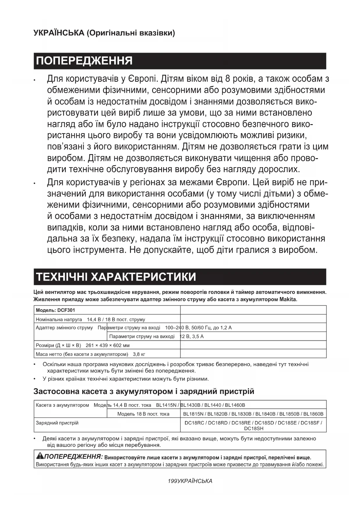 ДлякористувачівурегіонахзамежамиЄвропи.Цейвирібнепри- значенийдлявикористанняособами(утомучислідітьми)зобме- женимифізичними,сенсорнимиаборозумовимиздібностями йособамизнедостатнімдосвідомізнаннями,завиключенням випадків,колизанимивстановленонаглядабоособа,відпові- дальназаїхбезпеку,надалаїмінструкціїстосовновикористання цьогоінструмента.Недопускайте,щобдітигралисязвиробом. ТЕХНІЧНІ ХАРАКТЕРИСТИКИ Цей вентилятор має трьохшвидкісне керування, режим поворотів головки й таймер автоматичного вимкнення. Живлення приладу може забезпечувати адаптер змінного струму або касета з акумулятором Makita. Модель: DCF301Номінальнанапруга 14,4В/18Впост.струмуАдаптерзмінногоструму Параметриструмунавході 100–240В,50/60Гц,до1,2АПараметриструмунавиході 12В,3,5АРозміри(Д×Ш×В) 261×439×602ммМасанетто(безкасетизакумулятором) 3,8кг