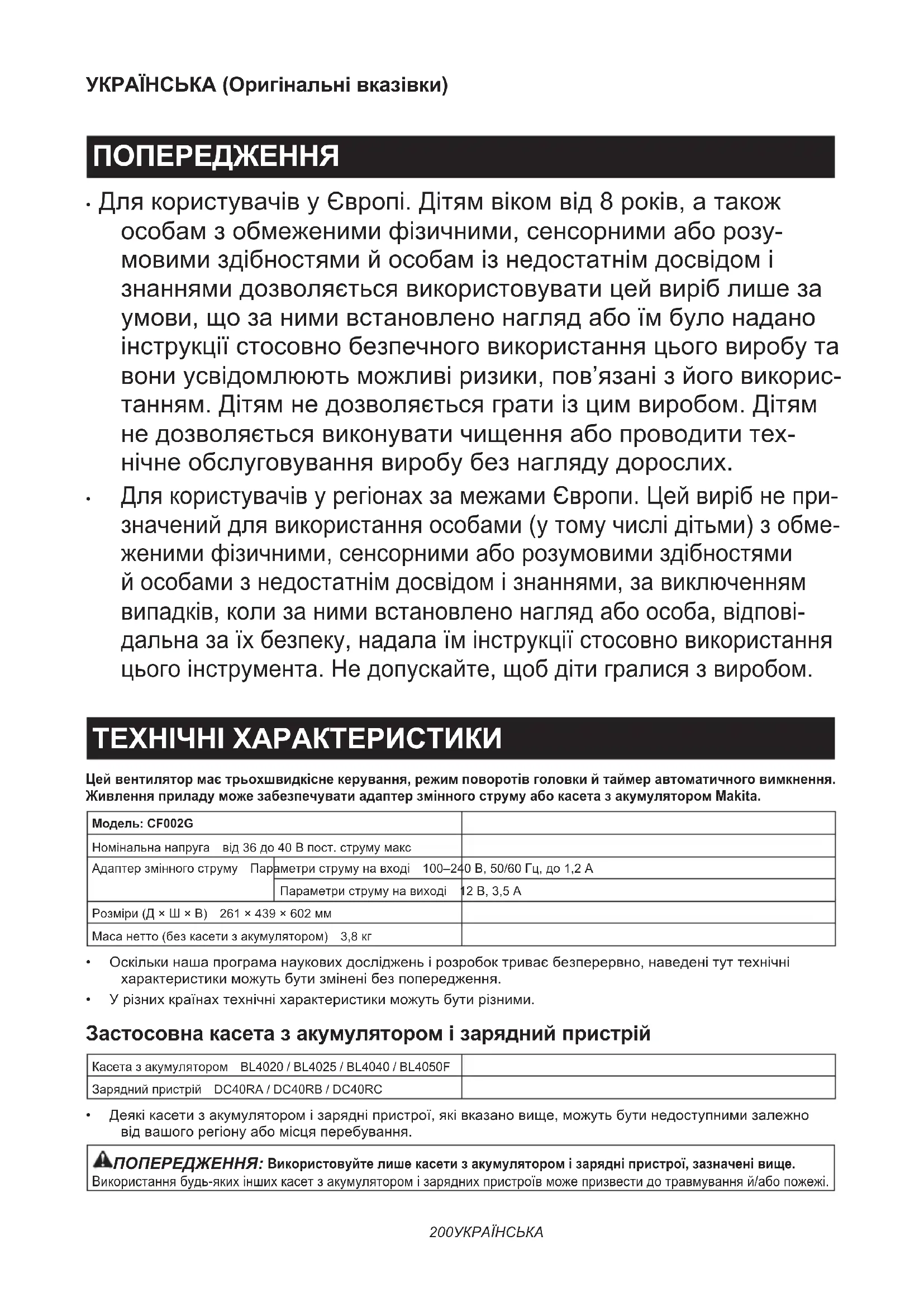 ДлякористувачівурегіонахзамежамиЄвропи.Цейвирібнепри- значенийдлявикористанняособами(утомучислідітьми)зобме- женимифізичними,сенсорнимиаборозумовимиздібностями йособамизнедостатнімдосвідомізнаннями,завиключенням випадків,колизанимивстановленонаглядабоособа,відпові- дальназаїхбезпеку,надалаїмінструкціїстосовновикористання цьогоінструмента.Недопускайте,щобдітигралисязвиробом. ТЕХНІЧНІ ХАРАКТЕРИСТИКИ Цей вентилятор має трьохшвидкісне керування, режим поворотів головки й таймер автоматичного вимкнення. Живлення приладу може забезпечувати адаптер змінного струму або касета з акумулятором Makita. Модель: CF002GНомінальнанапруга від36до40Впост.струмумаксАдаптерзмінногоструму Параметриструмунавході 100–240В,50/60Гц,до1,2АПараметриструмунавиході 12В,3,5АРозміри(Д×Ш×В) 261×439×602ммМасанетто(безкасетизакумулятором) 3,8кг