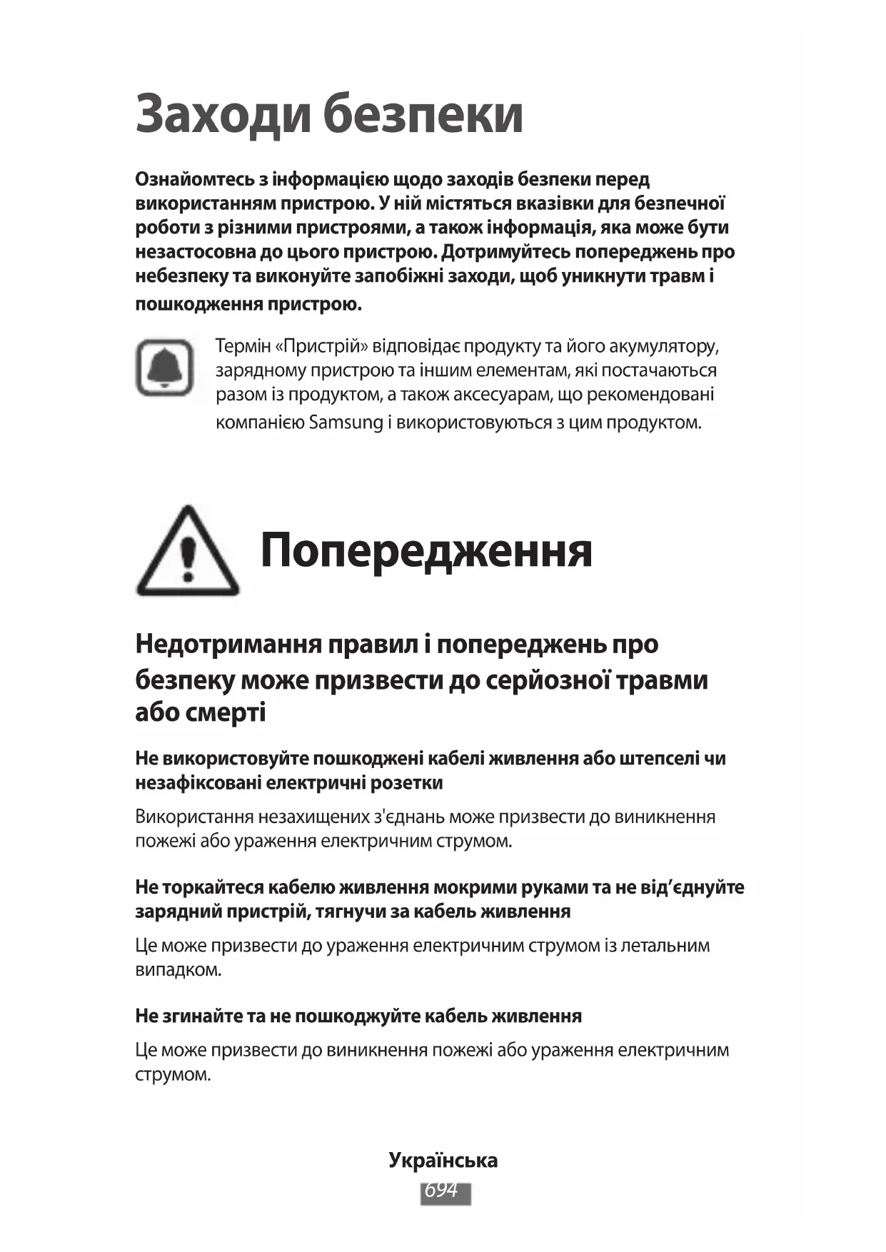 Заходи безпеки Ознайомтесь з інформацією щодо заходів безпеки перед використанням пристрою. У ній містяться вказівки для безпечної роботи з різними пристроями, а також інформація, яка може бути незастосовна до цього пристрою. Дотримуйтесь попереджень про небезпеку та виконуйте запобіжні заходи, щоб уникнути травм і пошкодження пристрою. Термін «Пристрій» відповідає продукту та його акумулятору, зарядному пристрою та іншим елементам, які постачаються разом із продуктом, а також аксесуарам, що рекомендовані компанією Samsung і використовуються з цим продуктом. Попередження Недотримання правил і попереджень про безпеку може призвести до серйозної травми