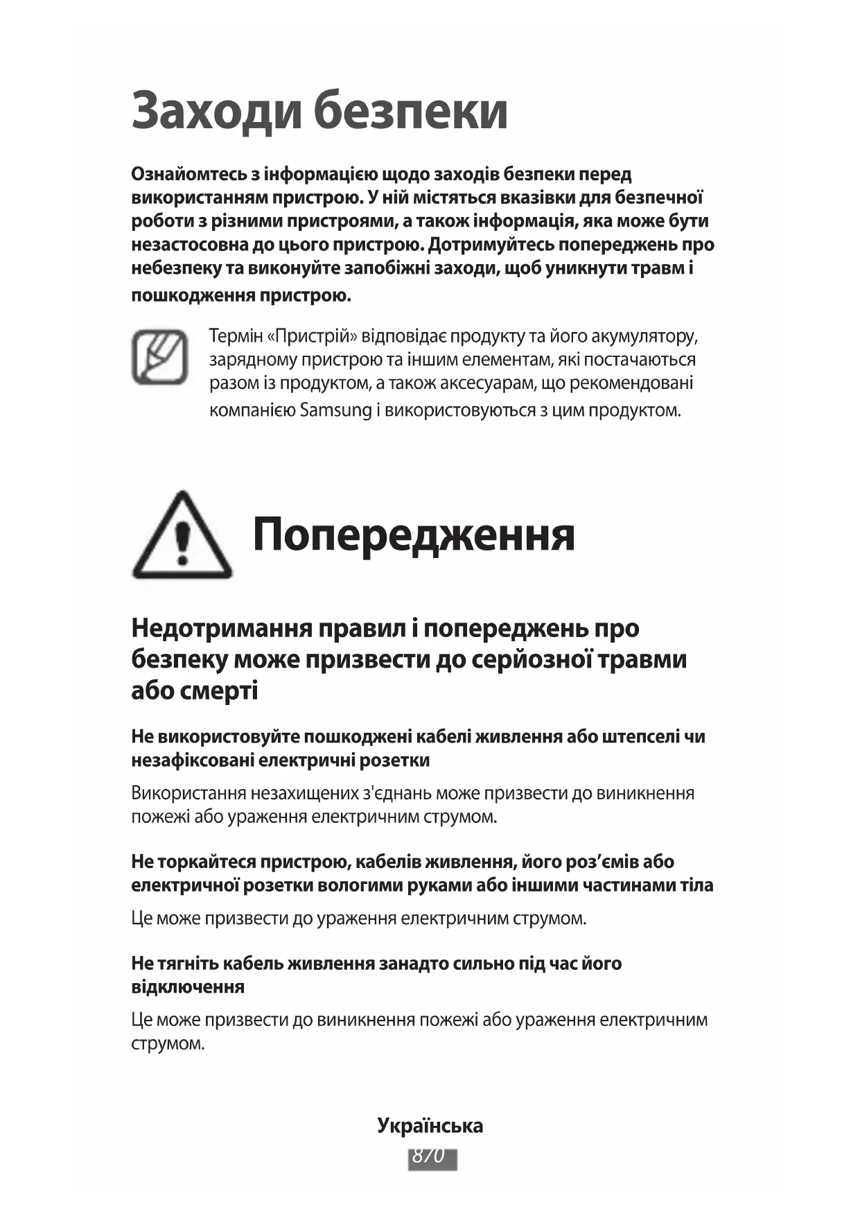 Заходи безпеки Ознайомтесь з інформацією щодо заходів безпеки перед використанням пристрою. У ній містяться вказівки для безпечної роботи з різними пристроями, а також інформація, яка може бути незастосовна до цього пристрою. Дотримуйтесь попереджень про небезпеку та виконуйте запобіжні заходи, щоб уникнути травм і пошкодження пристрою. Термін «Пристрій» відповідає продукту та його акумулятору, зарядному пристрою та іншим елементам, які постачаються разом із продуктом, а також аксесуарам, що рекомендовані компанією Samsung і використовуються з цим продуктом. Попередження Недотримання правил і попереджень про безпеку може призвести до серйозної травми