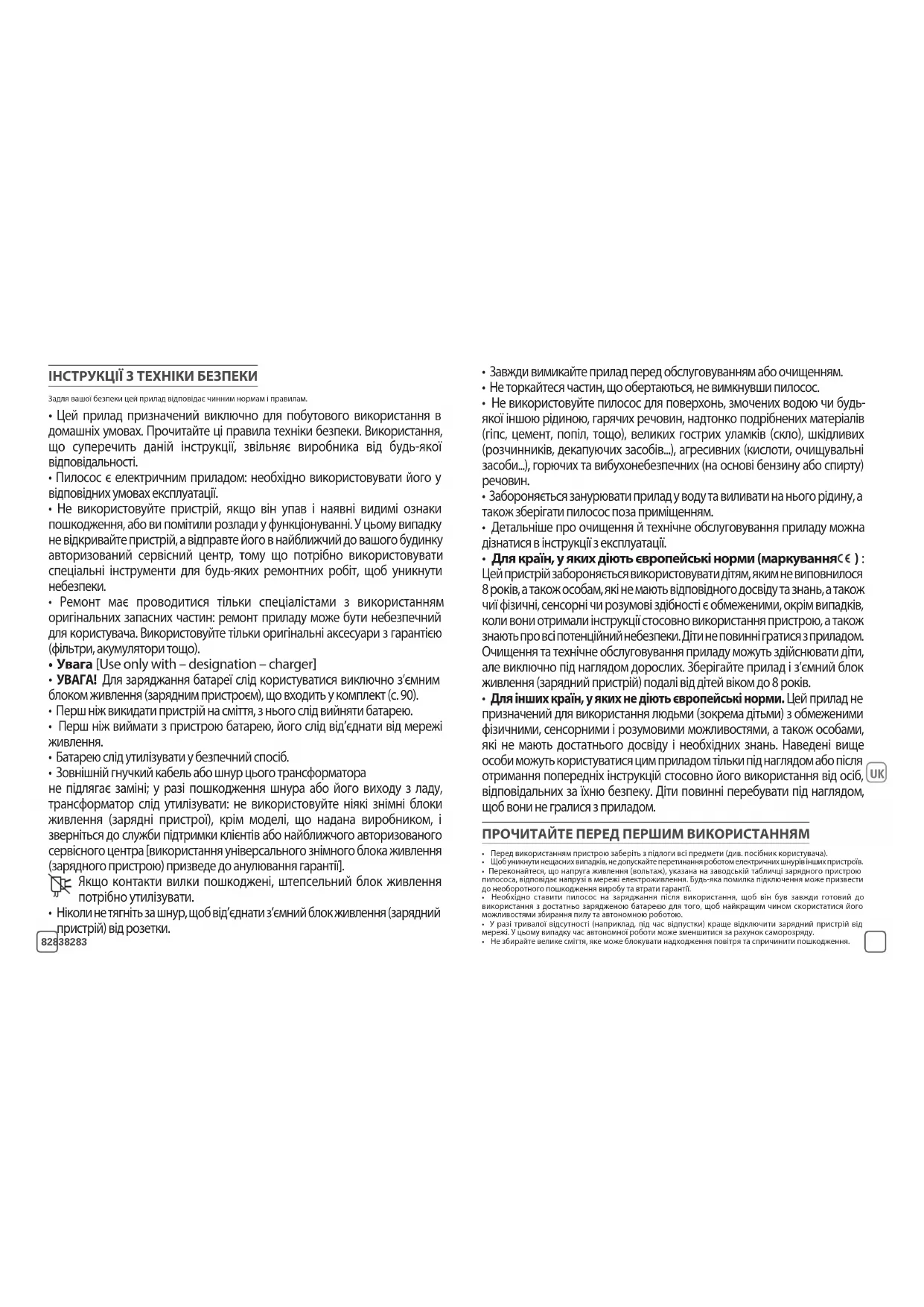 - Ремонт має проводитися тільки спеціалістами з використанням оригінальних запасних частин: ремонт приладу може бути небезпечний для користувача. Використовуйте тільки оригінальні аксесуари з гарантією (фільтри, акумулятори тощо).