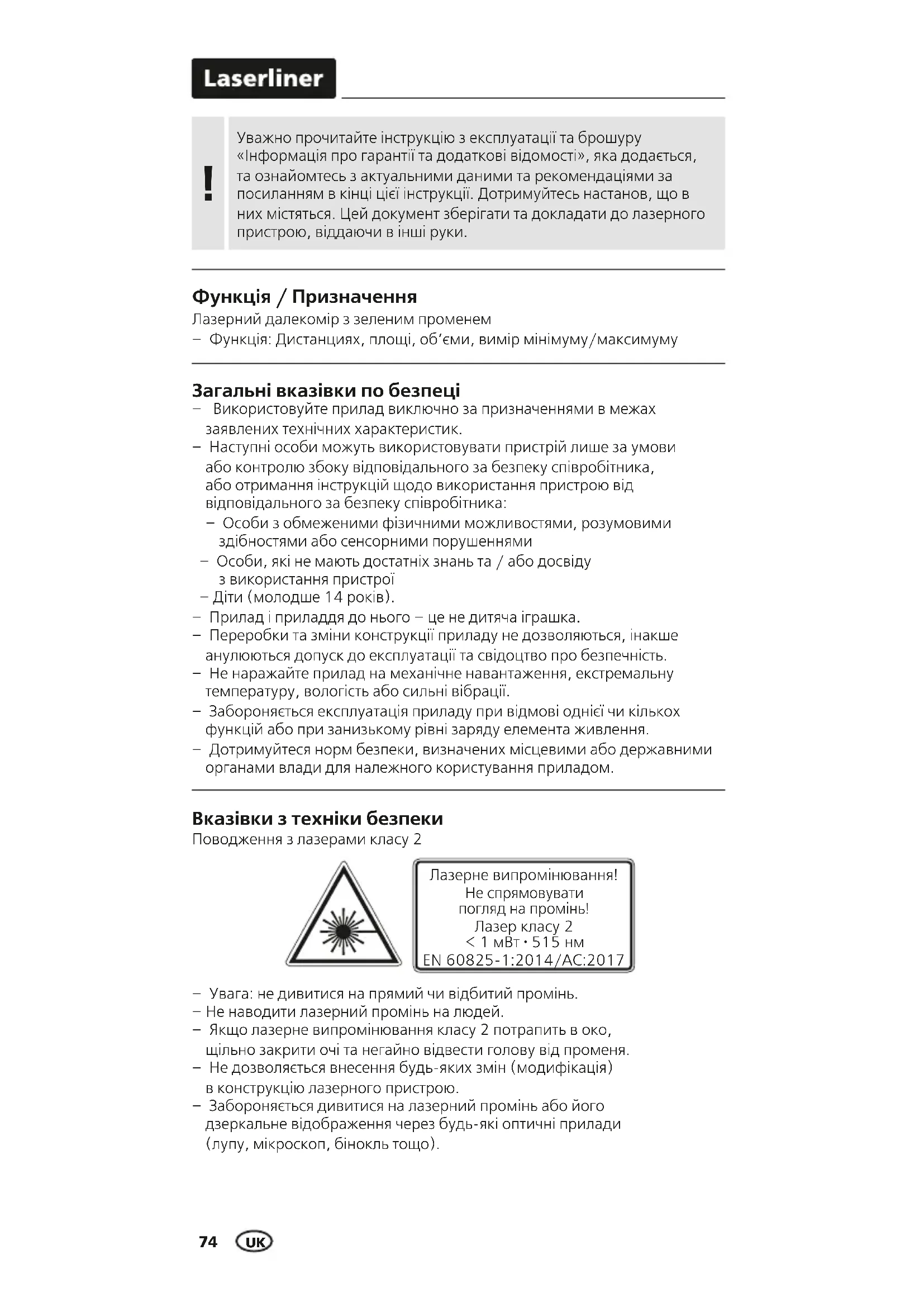 Для обеспечения точности результатов измерений и функциональности следует регулярно проводить калибровку и проверку измерительного прибора. Мы рекомендуем интервалы калибровки 1 – 2 года. Вы можете получить консультацию по этому вопросу у вашего продавца или сотрудников службы поддержки UMAREX-LASERLINER.74 – Увага: не дивитися на прямий чи відбитий промінь. – Не наводити лазерний промінь на людей. – Якщо лазерне випромінювання класу 2 потрапить в око, щільно закрити очі та негайно відвести голову від променя. – Не дозволяється внесення будь-яких змін (модифікація) в конструкцію лазерного пристрою. – Забороняється дивитися на лазерний промінь або його дзеркальне відображення через будь-які оптичні прилади (лупу, мікроскоп, бінокль тощо). Лазерне випромінювання! Не спрямовувати погляд на промінь! Лазер класу 2 < 1 мВт · 515 нм EN 60825-1:2014/AC:2017 Вказівки з техніки безпеки Поводження з лазерами класу 2 Загальні вказівки по безпеці – Використовуйте прилад виключно за призначеннями в межах заявлених технічних характеристик. – Наступні особи можуть використовувати пристрій лише за умови або контролю збоку відповідального за безпеку співробітника, або отримання інструкцій щодо використання пристрою від відповідального за безпеку співробітника: – Особи з обмеженими фізичними можливостями, розумовими здібностями або сенсорними порушеннями – Особи, які не мають достатніх знань та / або досвіду з використання пристрої – Діти (молодше 14 років). – Прилад і приладдя до нього – це не дитяча іграшка. – Переробки та зміни конструкції приладу не дозволяються, інакше анулюються допуск до експлуатації та свідоцтво про безпечність. – Не наражайте прилад на механічне навантаження, екстремальну температуру, вологість або сильні вібрації. – Забороняється експлуатація приладу при відмові однієї чи кількох функцій або при занизькому рівні заряду елемента живлення. – Дотримуйтеся норм безпеки, визначених місцевими або державними органами влади для належного користування приладом. Лазерний далекомір з зеленим променем – Функція: Дистанциях, площі, об‘єми, вимір мінімуму/максимуму Функція / Призначення Уважно прочитайте інструкцію з експлуатації та брошуру «Інформація про гарантії та додаткові відомості», яка додається, та ознайомтесь з актуальними даними та рекомендаціями за посиланням в кінці цієї інструкції. Дотримуйтесь настанов, що в них містяться. Цей документ зберігати та докладати до лазерного пристрою, віддаючи в інші руки.