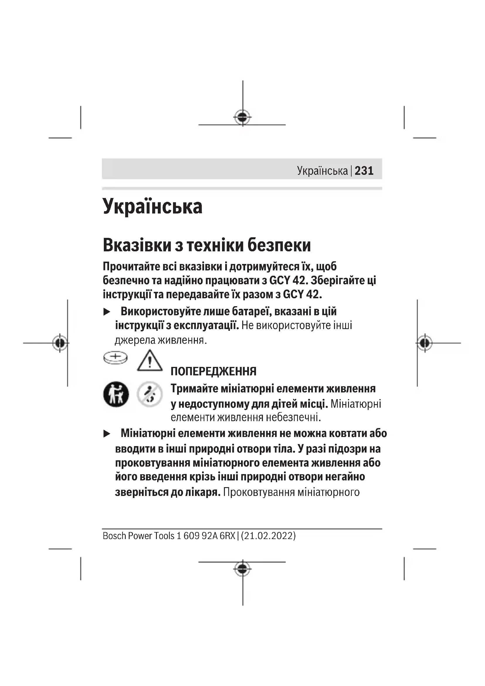 Вказівки з техніки безпеки Прочитайте всі вказівки і дотримуйтеся їх, щоб безпечно та надійно працювати з GCY42. Зберігайте ці інструкції та передавайте їх разом з GCY42. u Використовуйте лише батареї, вказані в цій інструкції з експлуатації. Не використовуйте інші джерела живлення. ПОПЕРЕДЖЕННЯ Тримайте мініатюрні елементи живлення у недоступному для дітей місці. Мініатюрні елементи живлення небезпечні. u Мініатюрні елементи живлення не можна ковтати або вводити в інші природні отвори тіла. У разі підозри на проковтування мініатюрного елемента живлення або його введення крізь інші природні отвори негайно зверніться до лікаря. Проковтування мініатюрного Bosch Power Tools 1 609 92A 6RX | (21.02.2022)232 | Українська елемента живлення може протягом 2годин призвести до важких внутрішніх опіків і смерті. u Виконуйте заміну мініатюрних елементів живлення належним чином. Існує небезпека вибуху. u Використовуйте лише елементи живлення кнопкового типу, вказані в цій інструкції з експлуатації. Не використовуйте будь-які інші мініатюрні елементи живлення або інші джерела струму. u Не намагайтеся знову зарядити мініатюрний елемент живлення і на закорочуйте мініатюрний елемент живлення. Мініатюрний елемент живлення може втратити герметичність, вибухнути, зайнятися і травмувати людей. u Виймайте й утилізуйте розряджені мініатюрні елементи живлення згідно з приписами. Розряджені мініатюрні елементи живлення можуть втратити герметичність і пошкодити продукт або травмувати