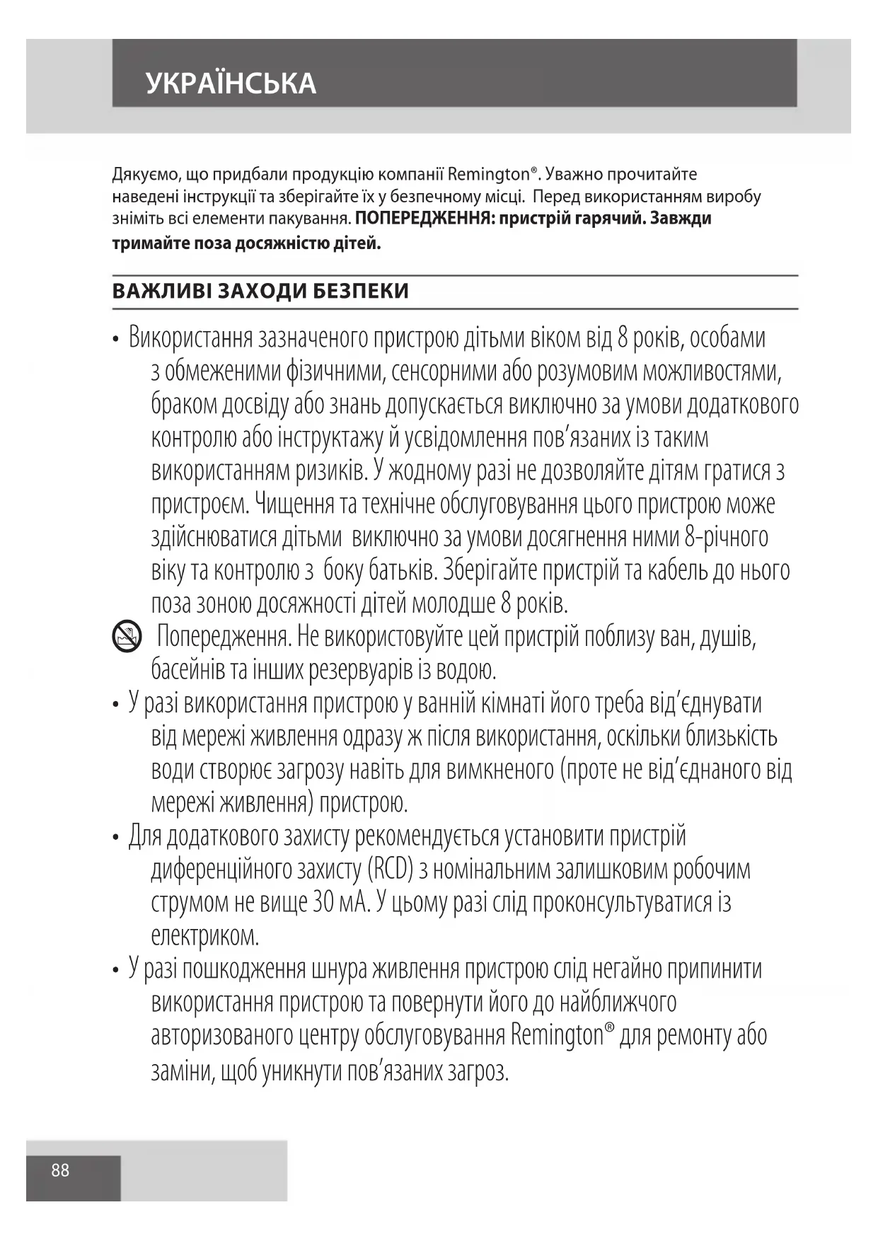 - У разі пошкодження шнура живлення пристрою слід негайно припинити використання пристрою та повернути його до найближчого авторизованого центру обслуговування Remington® для ремонту або заміни, щоб уникнути пов’язаних загроз. УКРАЇНСЬКА89