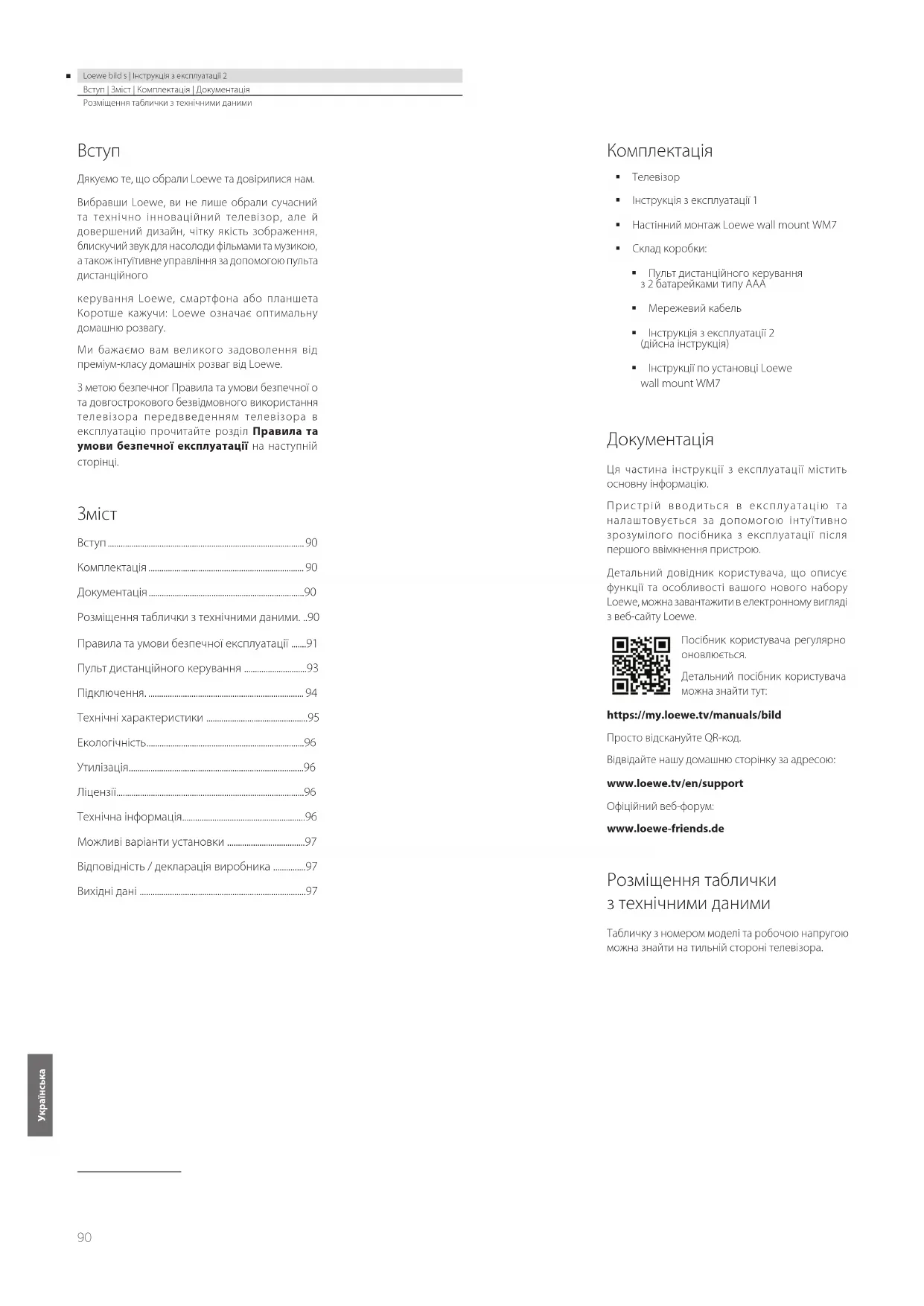 Інструкція з експлуатації 1 Настінний монтаж Loewe wall mount WM7 Склад коробки: Пульт дистанційного керування з 2 батарейками типу AAA Мережевий кабель Інструкція з експлуатації 2 (дійсна інструкція) Інструкції по установці Loewe wall mount WM7 Документація Ця частина інструкції з експлуатації містить основну інформацію. Пристрій вводиться в експлуатацію та налаштовується за допомогою інтуїтивно зрозумілого посібника з експлуатації після першого ввімкнення пристрою. Детальний довідник користувача, що описує функції та особливості вашого нового набору Loewe, можна завантажити в електронному вигляді з веб-сайту Loewe. Посібник користувача регулярно оновлюється. Детальний посібник користувача можна знайти тут: https://my.loewe.tv/manuals/bild Просто відскануйте QR-код. Відвідайте нашу домашню сторінку за адресою: www.loewe.tv/en/support Офіційний веб-форум: www.loewe-friends.de Розміщення таблички з технічними даними Табличку з номером моделі та робочою напругою можна знайти на тильній стороні телевізора.91 deutsch