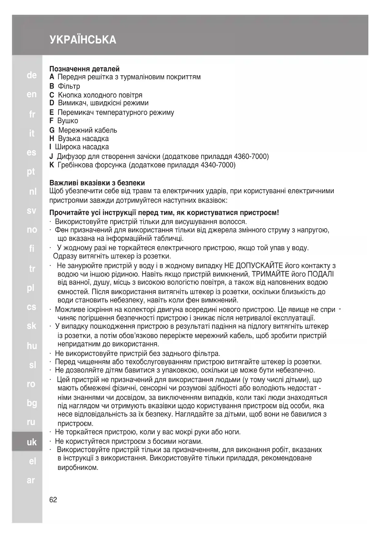 Передня решітка з турмаліновим покриттям B Фільтр C Кнопка холодного повітря D Вимикач, швидкісні режими E Перемикач температурного режиму F Вушко G Мережний кабель H Вузька насадка I Широка насадка J Дифузор для створення зачіски (додаткове приладдя 4360-7000) K Гребінкова форсунка (додаткове приладдя 4340-7000) Важливі вказівки з безпеки Щоб убезпечити себе від травм та електричних ударів, при користуванні електричними пристроями завжди дотримуйтеся наступних вказівок: Прочитайте усі інструкції перед тим, як користуватися пристроєм!