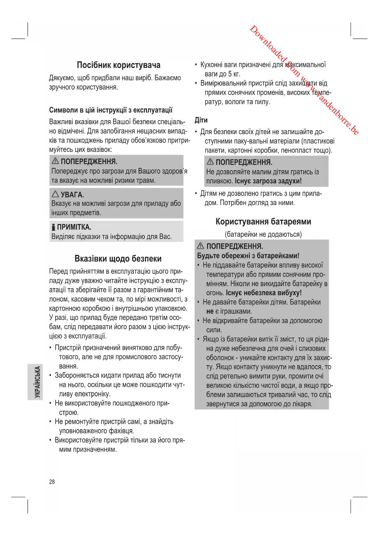 - Якщо із батарейки витік її зміст, то ця ріди- на дуже небезпечна для очей і слизових оболонок - уникайте контакту для їх захис- ту. Якщо контакту уникнути не вдалося, то слід ретельно вимити руки, промити очі великою кількістю чистої води, а якщо про- блеми залишаються тривалий час, то слід звернутися за допомогою до лікаря. Downloaded from www.vandenborre.be29