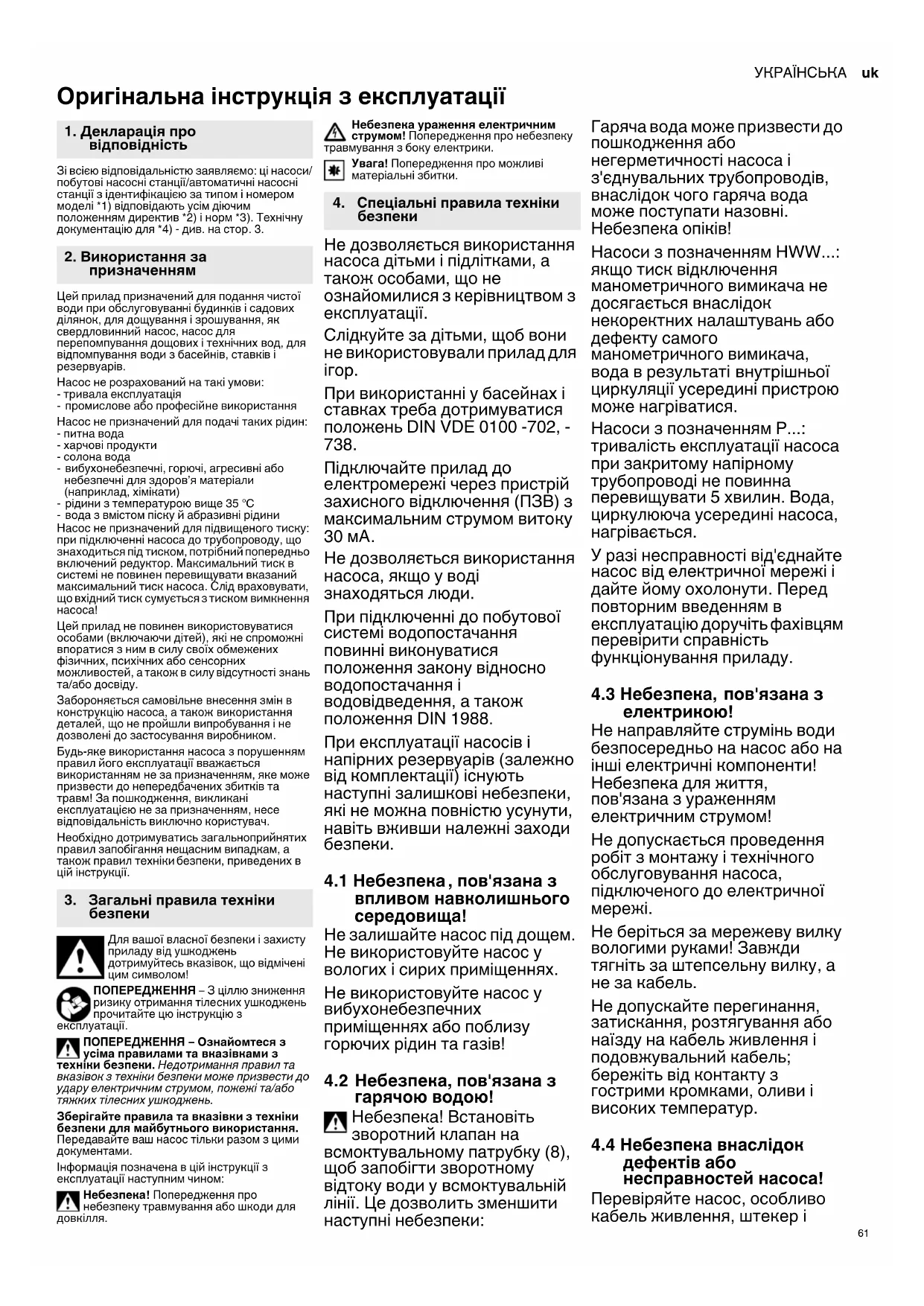 Не дозволяється використання насоса, якщо у воді знаходяться люди. При підключенні до побутової системі водопостачання повинні виконуватися положення закону відносно водопостачання і водовідведення, а також положення DIN 1988. При експлуатації насосів і напірних резервуарів (залежно від комплектації) існують наступні залишкові небезпеки, які не можна повністю усунути, навіть вживши належні заходи