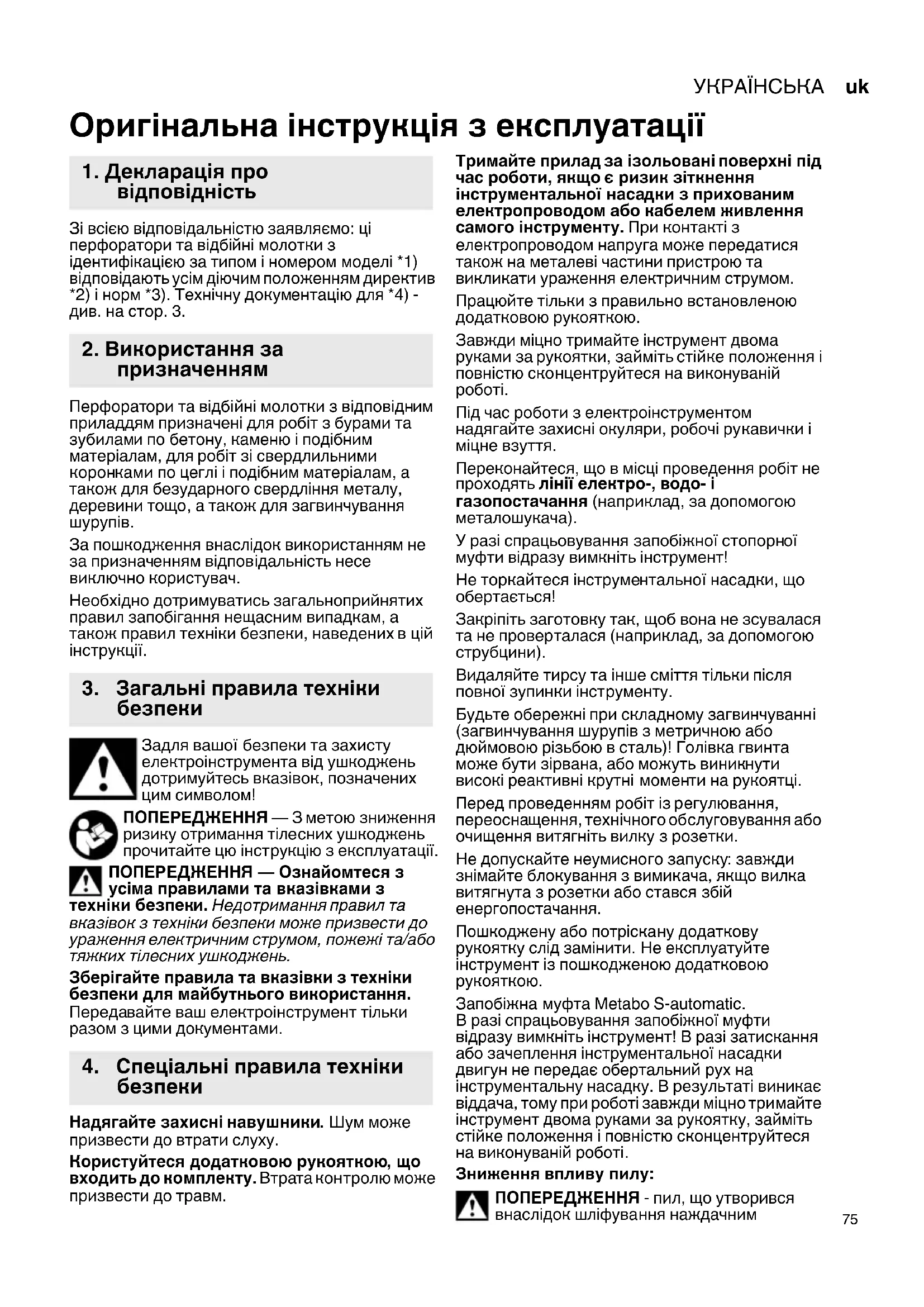 Зі всією відповідальністю заявляємо: ці перфоратори та відбійні молотки з ідентифікацією за типом і номером моделі *1) відповідають усім діючим положенням директив *2) і норм *3). Технічну документацію для *4) - див. на стор. 3. Перфоратори та відбійні молотки з відповідним приладдям призначені для робіт з бурами та зубилами по бетону, каменю і подібним матеріалам, для робіт зі свердлильними коронками по цеглі і подібним матеріалам, а також для безударного свердління металу, деревини тощо, а також для загвинчування