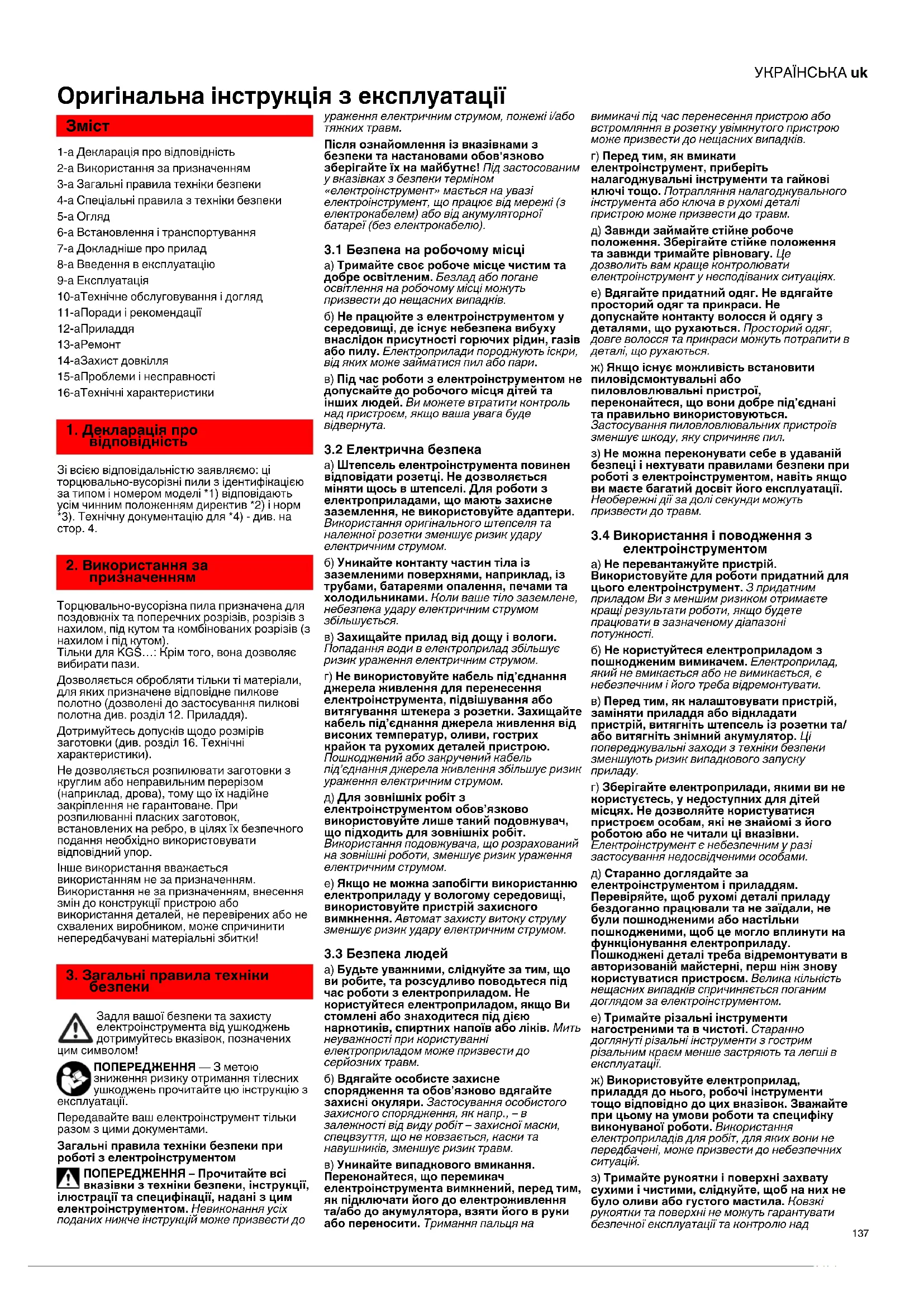 Оригінальна інструкція з експлуатації 1-а Декларація про відповідність 2-а Використання за призначенням 3-а Загальні правила техніки безпеки 4-а Спеціальні правила з техніки безпеки 5-а Огляд 6-а Встановлення і транспортування 7-а Докладніше про прилад 8-а Введення в експлуатацію 9-а Експлуатація 10-аТехнічне обслуговування і догляд 11-аПоради і рекомендації 12-аПриладдя 13-аРемонт 14-аЗахист довкілля 15-аПроблеми і несправності 16-аТехнічні характеристики Зі всією відповідальністю заявляємо: ці торцювально-вусорізні пили з ідентифікацією за типом і номером моделі *1) відповідають усім чинним положенням директив *2) і норм *3). Технічну документацію для *4) - див. на стор. 4. Торцювально-вусорізна пила призначена для поздовжніх та поперечних розрізів, розрізів з нахилом, під кутом та комбінованих розрізів (з нахилом і під кутом). Тільки для KGS…: Крім того, вона дозволяє вибирати пази. Дозволяється обробляти тільки ті матеріали, для яких призначене відповідне пилкове полотно (дозволені до застосування пилкові полотна див. розділ 12. Приладдя). Дотримуйтесь допусків щодо розмірів заготовки (див. розділ 16. Технічні характеристики). Не дозволяється розпилювати заготовки з круглим або неправильним перерізом (наприклад, дрова), тому що їх надійне закріплення не гарантоване. При розпилюванні пласких заготовок, встановлених на ребро, в цілях їх безпечного подання необхідно використовувати відповідний упор. Інше використання вважається використанням не за призначенням. Використання не за призначенням, внесення змін до конструкції пристрою або використання деталей, не перевірених або не схвалених виробником, може спричинити непередбачувані матеріальні збитки! Задля вашої безпеки та захисту електроінструмента від ушкоджень дотримуйтесь вказівок, позначених цим символом! ПОПЕРЕДЖЕННЯ — З метою зниження ризику отримання тілесних ушкоджень прочитайте цю інструкцію з експлуатації. Передавайте ваш електроінструмент тільки разом з цими документами. Загальні правила техніки безпеки при роботі з електроінструментом ПОПЕРЕДЖЕННЯ – Прочитайте всі вказівки з техніки безпеки, інструкції, ілюстрації та специфікації, надані з цим електроінструментом. Невиконання усіх поданих нижче інструкцій може призвести до ураження електричним струмом, пожежі і/або тяжких травм. Після ознайомлення із вказівками з безпеки та настановами обов'язково зберігайте їх на майбутнє! Під застосованим у вказівках з безпеки терміном «електроінструмент» мається на увазі електроінструмент, що працює від мережі (з електрокабелем) або від акумуляторної батареї (без електрокабелю).