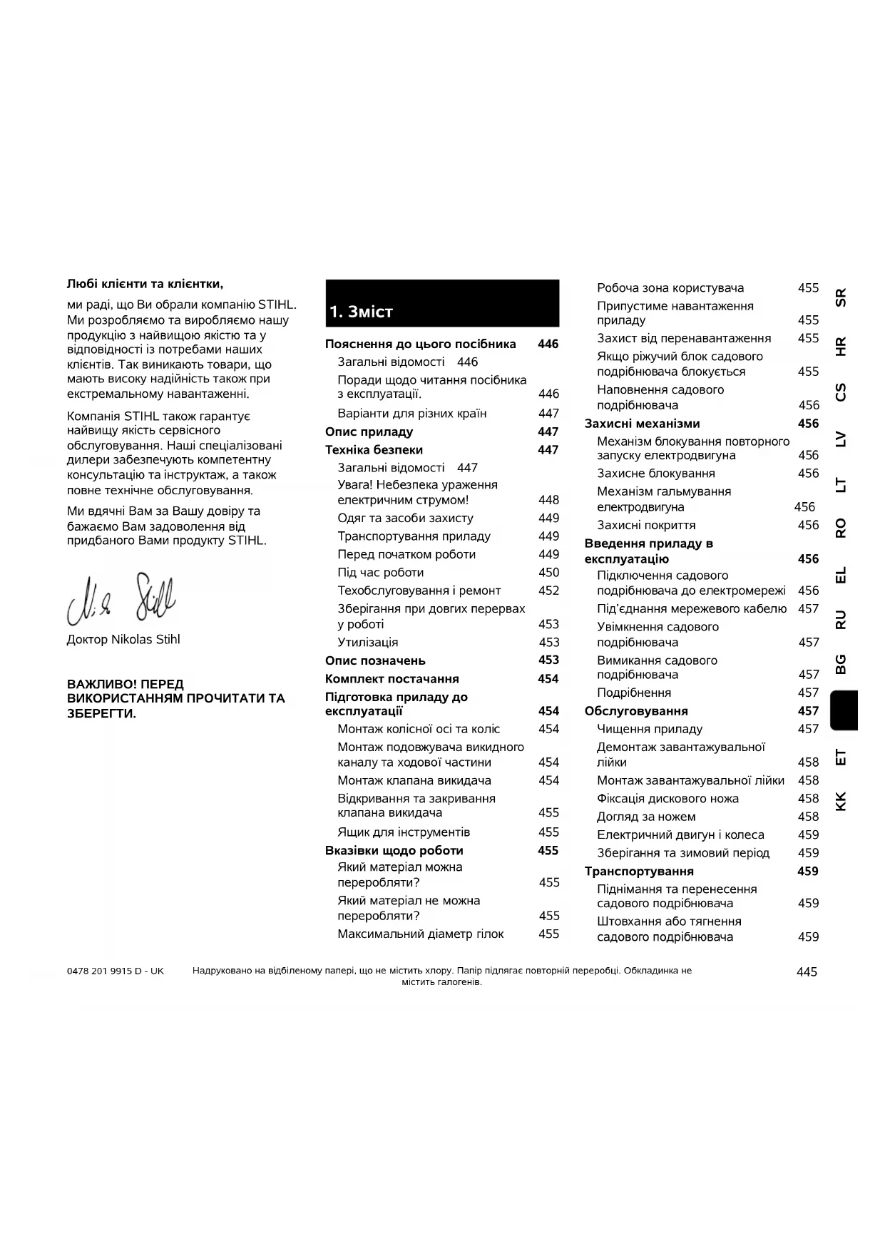 Любі клієнти та клієнтки, ми раді, що Ви обрали компанію STIHL. Ми розробляємо та виробляємо нашу продукцію з найвищою якістю та у відповідності із потребами наших клієнтів. Так виникають товари, що мають високу надійність також при екстремальному навантаженні. Компанія STIHL також гарантує найвищу якість сервісного обслуговування. Наші спеціалізовані дилери забезпечують компетентну консультацію та інструктаж, а також повне технічне обслуговування. Ми вдячні Вам за Вашу довіру та бажаємо Вам задоволення від придбаного Вами продукту STIHL. Доктор Nikolas Stihl ВАЖЛИВО! ПЕРЕД ВИКОРИСТАННЯМ ПРОЧИТАТИ ТА
