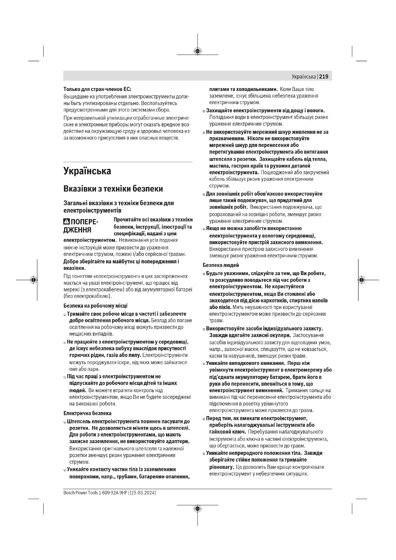 u Використовуйте засоби індивідуального захисту. Завжди вдягайте захисні окуляри. Застосування засобів індивідуального захисту для відповідних умов, напр.,захисної маски, спецвзуття, що не ковзається, каски та навушників, зменшує ризик травм. u Уникайте випадкового вмикання. Перш ніж увімкнути електроінструмент в електромережу або під’єднати акумуляторну батарею, брати його в руки або переносити, впевніться в тому, що електроінструмент вимкнений. Тримання пальця на вимикачі під час перенесення електроінструмента або підключення в розетку увімкнутого електроінструмента може призвести до травм. u Перед тим, як вмикати електроінструмент, приберіть налагоджувальні інструменти або гайковий ключ. Перебування налагоджувального інструмента або ключа в частині електроінструмента, що обертається, може призвести до травм. u Уникайте неприродного положення тіла. Завжди зберігайте стійке положення та тримайте рівновагу. Це дозволить Вам краще контролювати електроінструмент у небезпечних ситуаціях. Bosch Power Tools 1 609 92A 9HP | (25.03.2024)220 | Українська u Вдягайте придатний одяг. Не вдягайте просторий одяг та прикраси. Не підставляйте волосся й одяг до деталей, що рухаються. Просторий одяг, довге волосся та прикраси можуть потрапити в деталі, що