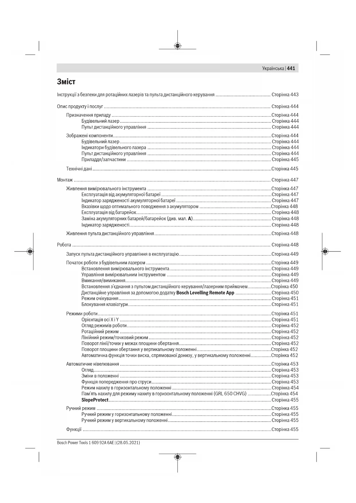 Інструкції з безпеки для ротаційних лазерів та пульта дистанційного керування ........................................ Сторінка443 Опис продукту і послуг ......................................................................................................................... Сторінка444 Призначення приладу ....................................................................................................................Сторінка444 Будівельний лазер..............................................................................................................Сторінка444 Пульт дистанційного управління ..........................................................................................Сторінка444 Зображені компоненти...................................................................................................................Сторінка444 Будівельний лазер..............................................................................................................Сторінка444 Індикатори будівельного лазера ..........................................................................................Сторінка444 Пульт дистанційного управління ..........................................................................................Сторінка444 Приладдя/запчастини .........................................................................................................Сторінка445 Технічні дані..................................................................................................................................Сторінка445 Монтаж ............................................................................................................................................... Сторінка447 Живлення вимірювального інструмента ..........................................................................................Сторінка447 Експлуатація від акумуляторної батареї ................................................................................Сторінка447 Індикатор зарядженості акумуляторної батареї .....................................................................Сторінка447 Вказівки щодо оптимального поводження з акумулятором ....................................................Сторінка448 Експлуатація від батарейок..................................................................................................Сторінка448 Заміна акумуляторних батарей/батарейок (див.мал.A).........................................................Сторінка448 Індикатор зарядженості.......................................................................................................Сторінка448 Живлення пульта дистанційного управління.....................................................................................Сторінка448 Робота ................................................................................................................................................ Сторінка448 Запуск пульта дистанційного управління в експлуатацію...................................................................Сторінка449 Початок роботи з будівельним лазером ...........................................................................................Сторінка449 Встановлення вимірювального інструмента..........................................................................Сторінка449 Управління вимірювальним інструментом ............................................................................Сторінка449 Вмикання/вимикання..........................................................................................................Сторінка449 Встановлення з’єднання з пультом дистанційного керування/лазерним приймачем.................Сторінка450 Дистанційне управління за допомогою додаткуBosch Levelling Remote App ..........................Сторінка450 Режим очікування...............................................................................................................Сторінка451 Блокування клавіатури........................................................................................................Сторінка451 Режими роботи..............................................................................................................................Сторінка451 Орієнтація осі X і Y ..............................................................................................................Сторінка451 Огляд режимів роботи.........................................................................................................Сторінка452 Ротаційний режим ..............................................................................................................Сторінка452 Лінійний режим/точковий режим.........................................................................................Сторінк