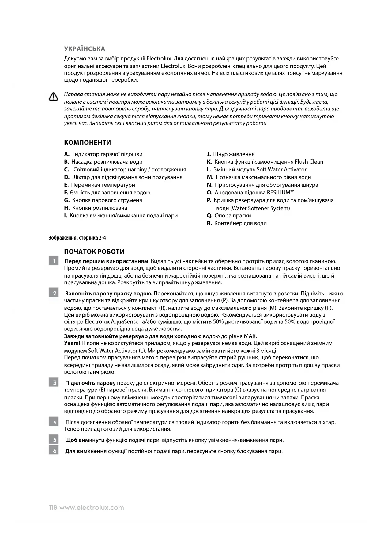 Дякуємо вам за вибір продукції Electrolux. Для досягнення найкращих результатів завжди використовуйте оригінальні аксесуари та запчастини Electrolux. Вони розроблені спеціально для цього продукту. Цей продукт розроблений з урахуванням екологічних вимог. На всіх пластикових деталях присутнє маркування щодо подальшої переробки. Парова станція може не виробляти пару негайно після наповнення приладу водою. Це пов’язано з тим, що наявне в системі повітря може викликати затримку в декілька секунд у роботі цієї функції. Будь ласка, зачекайте та повторіть спробу, натиснувши кнопку пари. Для зручності пара продовжить виходити ще протягом декілька секунд після відпускання кнопки, тому немає потреби тримати кнопку натиснутою увесь час. Знайдіть свій власний ритм для оптимального результату роботи.