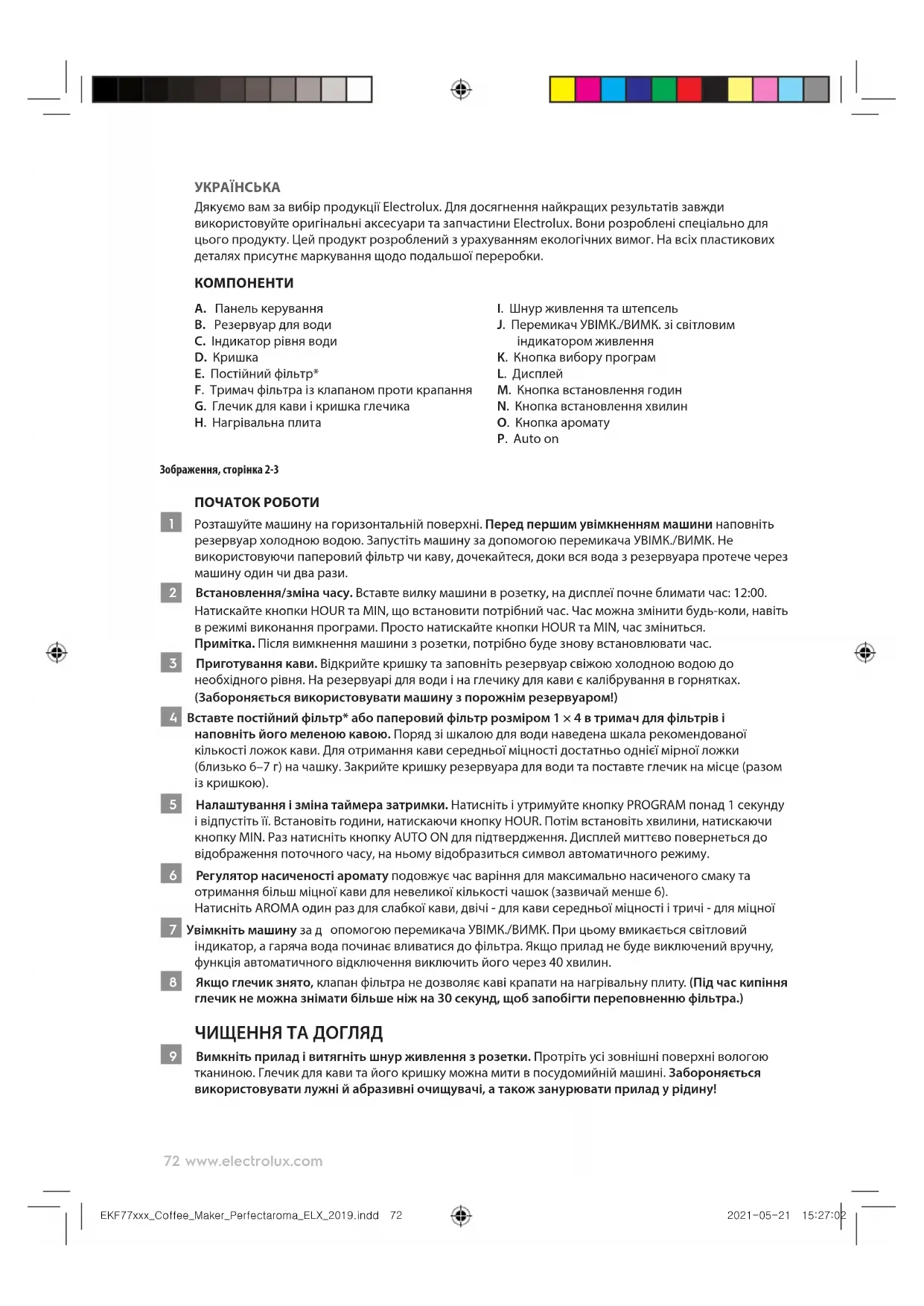 J. Перемикач УВІМК./ВИМК. зі світловим індикатором живлення K. Кнопка вибору програм L. Дисплей M. Кнопка встановлення годин N. Кнопка встановлення хвилин O. Кнопка аромату P. Auto on Зображення, сторінка 2-3 ПОЧАТОК РОБОТИ 1 Розташуйте машину на горизонтальній поверхні. Перед першим увімкненням машини наповніть резервуар холодною водою. Запустіть машину за допомогою перемикача УВІМК./ВИМК. Не використовуючи паперовий фільтр чи каву, дочекайтеся, доки вся вода з резервуара протече через машину один чи два рази. 2 Встановлення/зміна часу. Вставте вилку машини в розетку, на дисплеї почне блимати час: 12:00. Натискайте кнопки HOUR та MIN, що встановити потрібний час. Час можна змінити будь-коли, навіть в режимі виконання програми. Просто натискайте кнопки HOUR та MIN, час зміниться. Примітка. Після вимкнення машини з розетки, потрібно буде знову встановлювати час. 3 Приготування кави. Відкрийте кришку та заповніть резервуар свіжою холодною водою до необхідного рівня. На резервуарі для води і на глечику для кави є калібрування в горнятках. (Забороняється використовувати машину з порожнім резервуаром!) 4 Вставте постійний фільтр* або паперовий фільтр розміром 1 × 4 в тримач для фільтрів і наповніть його меленою кавою. Поряд зі шкалою для в оди наведена шкала рекомендованої кількості ложок кави. Для отримання кави середньої міцності достатньо однієї мірної ложки (близько 6–7 г) на чашку. Закрийте кришку резервуара для води та поставте глечик на місце (разом із кришкою). 5 Налаштування і зміна таймера затримки. Натисніть і утримуйте кнопку PROGRAM понад 1 секунду і відпустіть її. Встановіть години, натискаючи кнопку HOUR. Потім встановіть хвилини, натискаючи кнопку MIN. Pаз натисніть кнопку AUTO ON для підтвердження. Дисплей миттєво повернеться до відображення поточного часу, на ньому відобразиться символ автоматичного режиму. 6 Регулятор насиченості аромату подовжує час варіння для максимально насиченого смаку та отримання більш міцної кави для невеликої кількості чашок (зазвичай менше 6). Натисніть AROMA один раз для слабкої кави, двічі - для кави середньої міцності і тричі - для міцної 7 Увімкніть машину за д опомогою перемикача УВІМК./ВИМК. При цьому вмикається світловий індикатор, а гаряча вода починає вливатися до фільтра. Якщо прилад не буде виключений вручну, функція автоматичного відключення виключить його через 40 хвилин. EKF77xxx_Coffee_Maker_Perfectaroma_ELX_2019.indd 72 8 Якщо глечик знято, клапан фільтра не дозволяє каві крапати на нагрівальну плиту. (Під час кипіння глечик не можна знімати більше ніж на 30 секунд, щоб запобігти переповненню фільтра.) ЧИЩЕННЯ ТА ДОГЛЯД 9 Вимкніть прилад і витягніть шнур живлення з розетки. Протріть усі зовнішні поверхні вологою тканиною. Глечик для кави та його кришку можна мити в посудомийній машині. Забороняється використовувати лужні й абразивні очищувачі, а також занурювати прилад у рідину! 2021-05-21 15:27:0273www.electrolux.com 10 Щоб очистити тримач фільтра, підніміть рукоятку та зніміть тримач. Щоб ретельно очистити клапан фільтра, активуйте його кілька разів під час ополіскування. 11 В якості запобіжного заходу ми рекомендуємо видаляти накип після 70 використань. Використовуйте тільки екологічно чисті засоби для видалення накипу і завжди дотримуйтесь інструкцій виробника. 12 У якості запобіжного заходу рекомендуємо видалити накип із виробу після 70 разів вик
