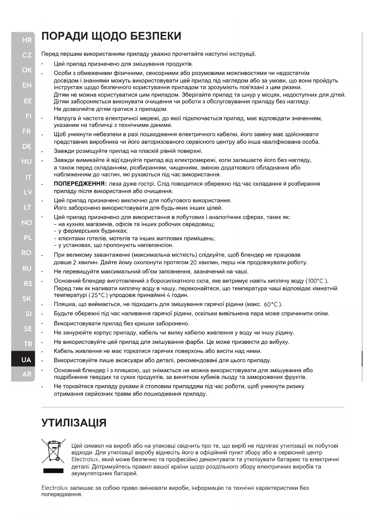 Цей символ на виробі або на упаковці свідчить про те, що виріб не підлягає утилізації як побутові відходи. Для утилізації виробу віднесіть його в офіційний пункт збору або в сервісний центр Electrolux, який може безпечно та професійно демонтувати та утилізувати батарею та електричні деталі. Дотримуйтесь правил вашої країни щодо роздільного збору електричних виробів та акумуляторних батарей. Electrolux залишає за собою право змінювати вироби, інформацію та технічні характеристики без попередження.HR