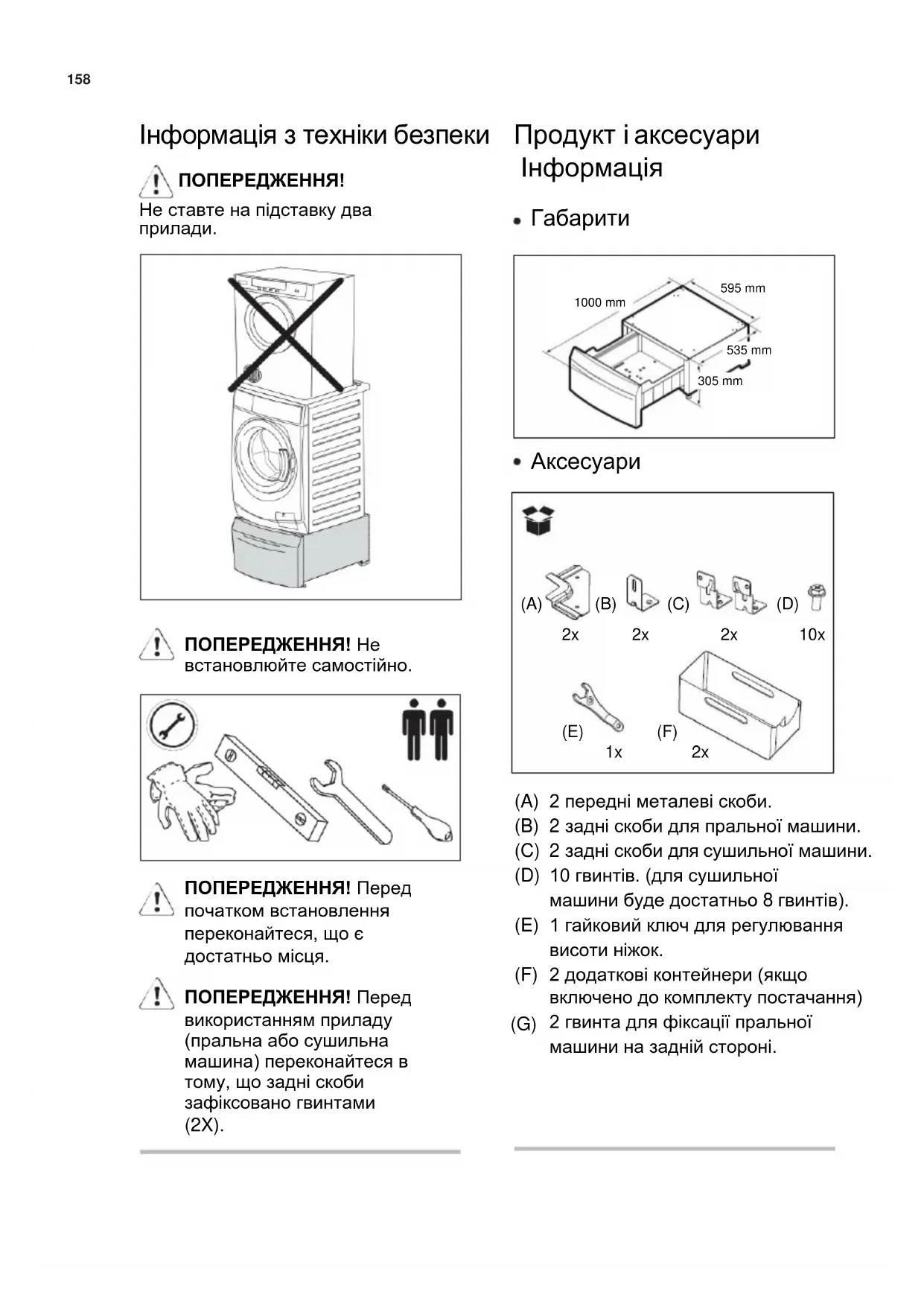 ПОПЕРЕДЖЕННЯ! Перед початком встановлення переконайтеся, що є достатньо місця. ПОПЕРЕДЖЕННЯ! Перед використанням приладу (пральна або сушильна машина) переконайтеся в тому, що задні скоби зафіксовано гвинтами (2X). (A) (B) (C) (D) (E) (F) (G) 2 передні металеві скоби. 2 задні скоби для пральної машини. 2 задні скоби для сушильної машини. 10 гвинтів. (для сушильної машини буде достатньо 8 гвинтів). 1 гайковий ключ для регулювання висоти ніжок. 2 додаткові контейнери (якщо включено до комплекту постачання) 2 гвинта для фіксації пральної машини на задній стороні.
