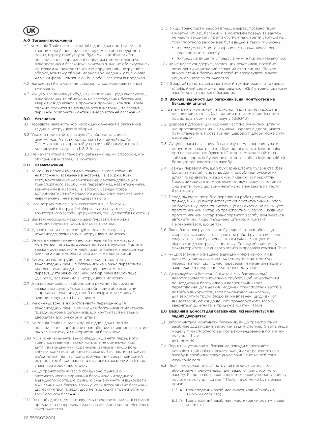 A.3 Якщо у вас виникнуть будь-які запитання щодо експлуатації, використання та обмежень на застосування багажника, зверніться до агента з продажів продукції компанії Thule. Уважно прочитайте всі відомості в інструкції та гарантії, перш ніж розпочати монтаж і використання багажника. B.0 Установка B.1 Перевірте наявність усіх необхідних елементів багажника згідно з інструкцією зі зборки. B.2 Уважно прочитайте інструкції зі зборки та список рекомендацій (якщо додається) і дотримуйтеся їх. Потім установіть пристрій у правильній послідовності, дотримуючись пунктів 1, 2, 3 й т. д. B.3 Не намагайтеся встановити багажник іншим способом, ніж описаний в інструкції з монтажу. C.0 Навантаження C.1 Не можна перевищувати максимальне навантаження на багажник, зазначене в інструкції зі зборки. Крім того, максимальне навантаження, рекомендоване для транспортного засобу, має перевагу над навантаженням, зазначеним в інструкції зі зборки. Завжди треба дотримуватися найменшого з дозволених максимальних навантажень і не перевищувати його. C.2 Параметр максимального навантаження на багажник, зазначений в інструкції зі зборки, застосовується як до транспортного засобу, що рухається, так і до засобів на стоянці. C.3 Вантаж необхідно надійно закріплювати. Не можна використовувати троси, що розтягуються. C.4 Дізнайтеся та не перевищуйте максимальну вагу велосипеда, зазначену в інструкціях з монтажу. C.5 За умови завантаження велосипедів на багажник, що монтується на задніх дверцятах або на буксирній штанзі, завжди розташовуйте найбільші та найважчі велосипеди ближче до автомобіля, а вже далі– менші та легші. C.6 Багажник сконструйовано лише для стандартних велосипедних рам. На багажнику не можна перевозити двомісні велосипеди. Завжди перевіряйте та не перевищуйте максимальний розмір рами велосипеда (діаметр), зазначений в інструкціях з монтажу. C.7 Для велосипедів із карбоновими рамами або вилками завжди консультуйтеся з виробниками або агентами із продажів велосипеда, щоб перевірити, чи можна їх використовувати з багажником. C.8 Рекомендовано використовувати перехідник для велосипедних рам Thule 982 для багажників із монтажем позаду, зокрема багажників, що монтуються на задніх дверцятах або буксирній штанзі. C.9 Компанія Thule не несе жодної відповідальності за пошкодження карбонових рам або вилок, яке може статися під час монтажу чи використання багажника. C.10 Усі зйомні елементи велосипеда слід зняти перед його транспортуванням, включно з, але не обмежуючись, дитячими сидіннями, корзинами, замками (якщо вони знімаються) і повітряними насосами. Такі частини можуть від’єднатися під час транспортування через підвищений опір повітря й коливання та становити загрозу для інших учасників дорожнього руху. C.11 Якщо транспортний засіб обладнано функцією автоматичного відкривання багажника чи заднього відкидного борта, цю функцію слід вимкнути й відкривати відділення для багажу вручну, коли встановлено багажник, що монтується позаду, щоб не пошкодити транспортний засіб або сам багажник. C.12 За необхідності до вантажу слід прикріпити належні світлові прилади та попереджувальні знаки відповідно до місцевого законодавства. C.13 Якщо транспортні засоби вперше зареєстровано після 1жовтня 1998р., багажник із монтажем позаду та вантаж не мають закривати третій стоп-сигнал. Тр