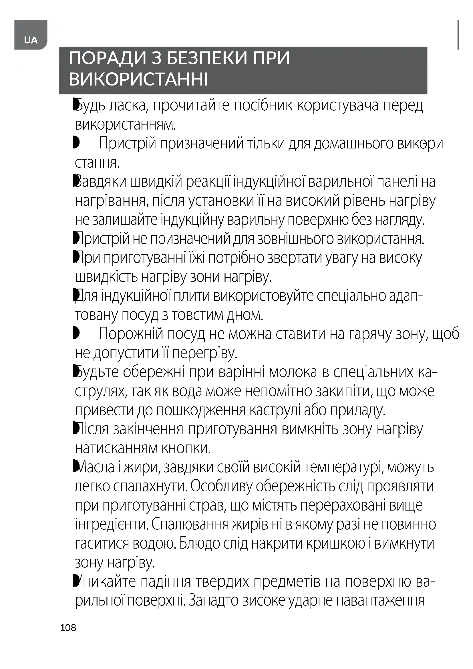 Завдяки швидкій реакції індукційної варильної панелі на нагрівання, після установки її на високий рівень нагріву не залишайте індукційну варильну поверхню без нагляду.