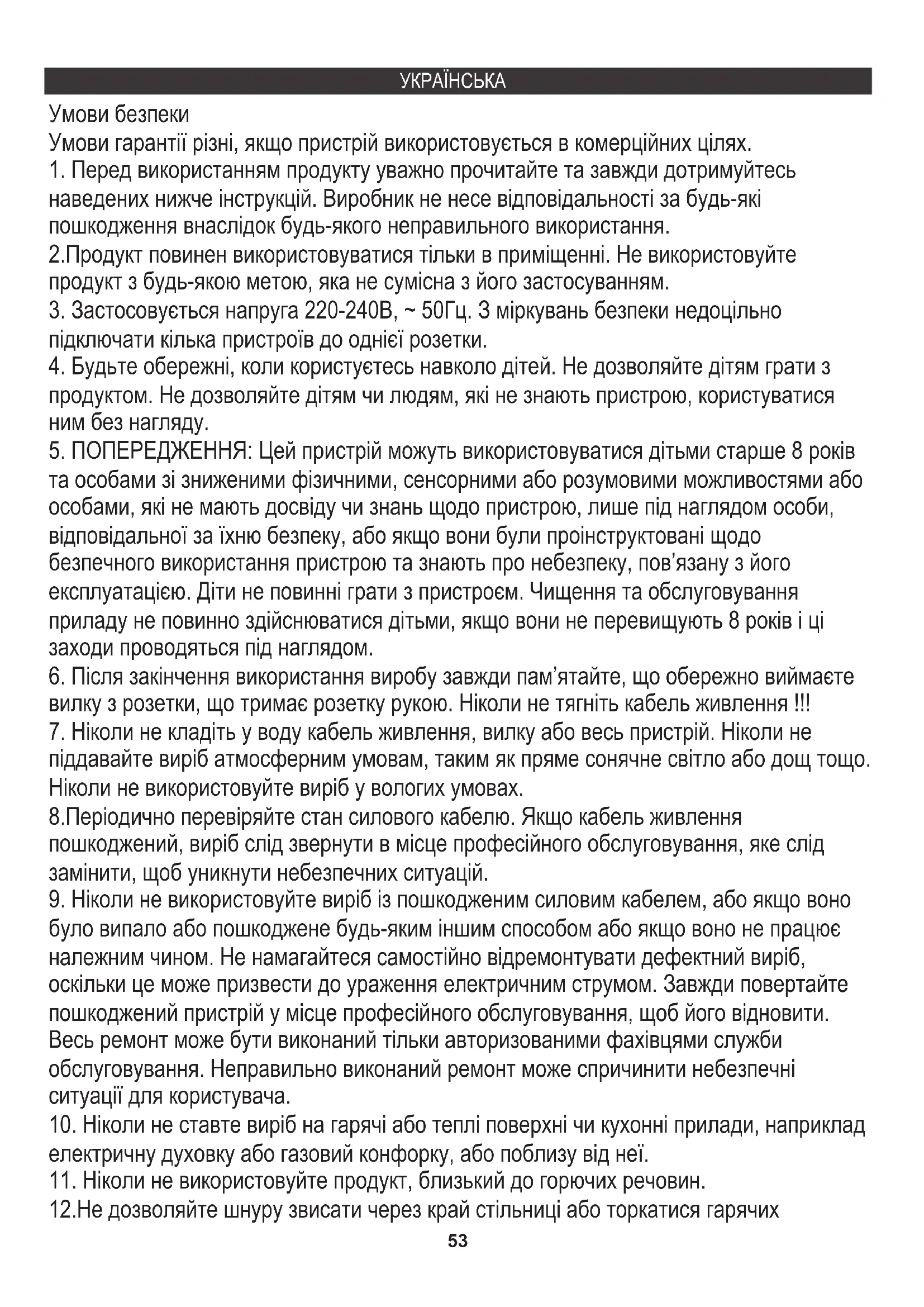 підключати кілька пристроїв до однієї розетки. Умови гарантії різні, якщо пристрій використовується в комерційних цілях. Умови безпеки 8.Періодично перевіряйте стан силового кабелю. Якщо кабель живлення пошкоджений, виріб слід звернути в місце професійного обслуговування, яке слід замінити, щоб уникнути небезпечних ситуацій.