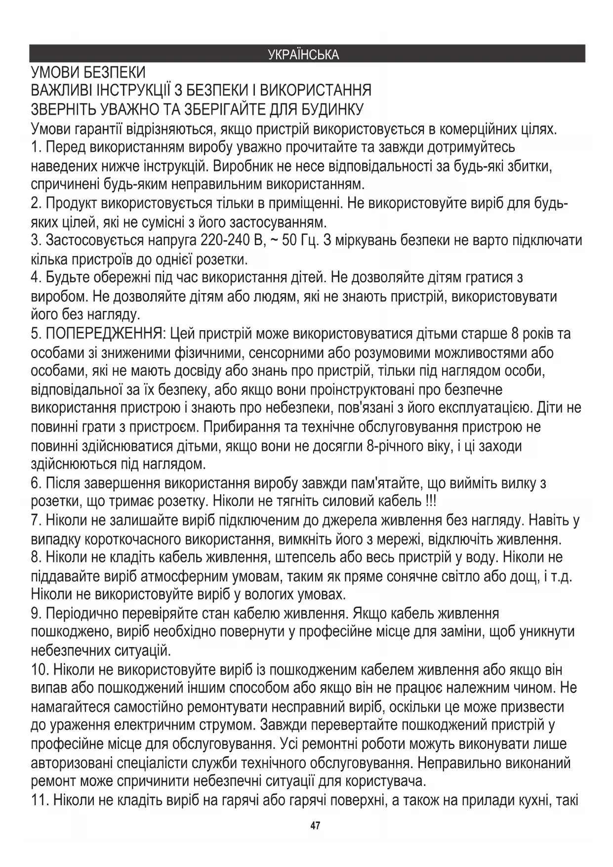 яких цілей, які не сумісні з його застосуванням. УМОВИ БЕЗПЕКИ ЗВЕРНІТЬ УВАЖНО ТА ЗБЕРІГАЙТЕ ДЛЯ БУДИНКУ
