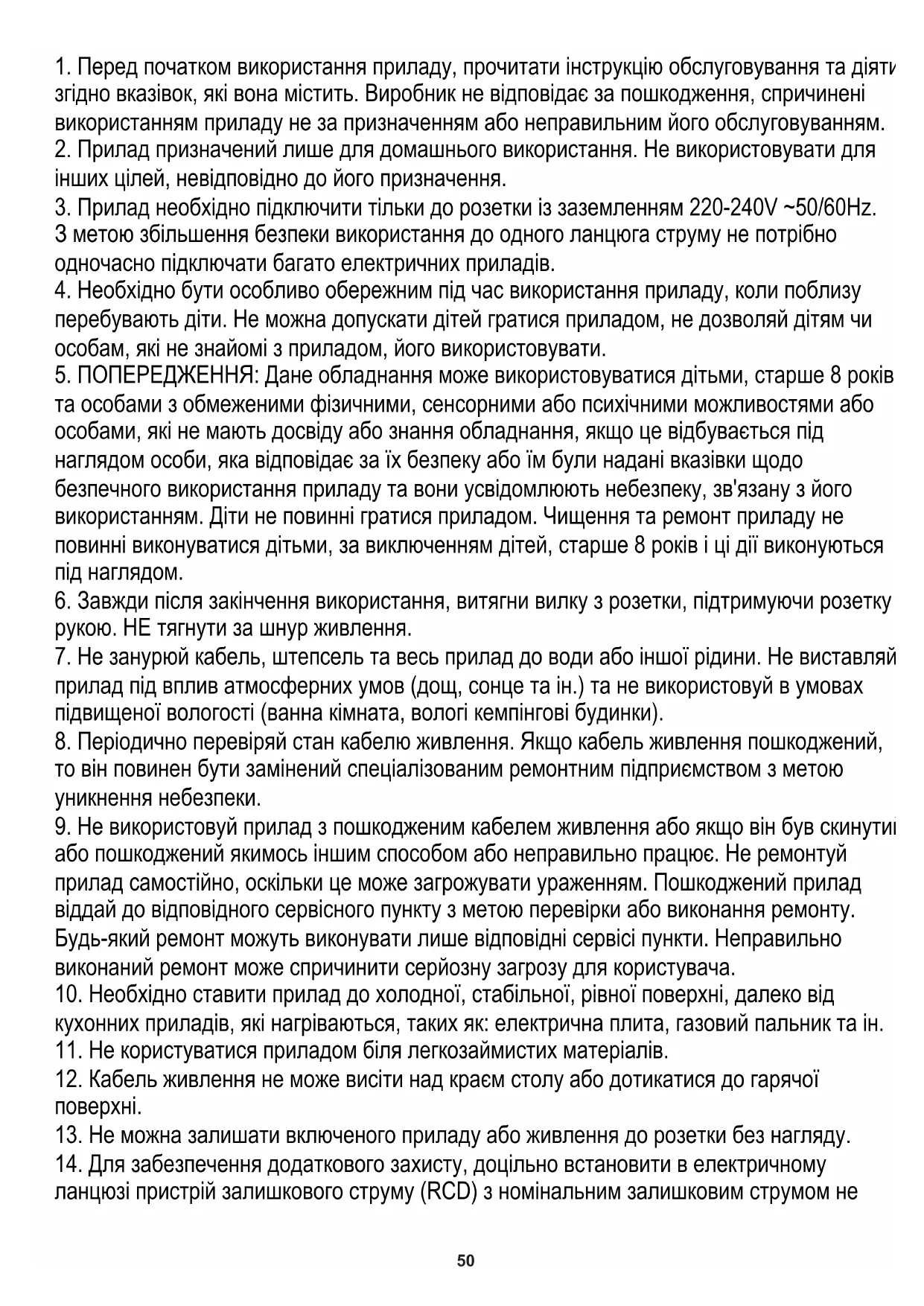 ланцюзі пристрій залишкового струму (RCD) з номінальним залишковим струмом не51 більше 30 мА. У зв'язку з цим необхідно звернутися до електрика.