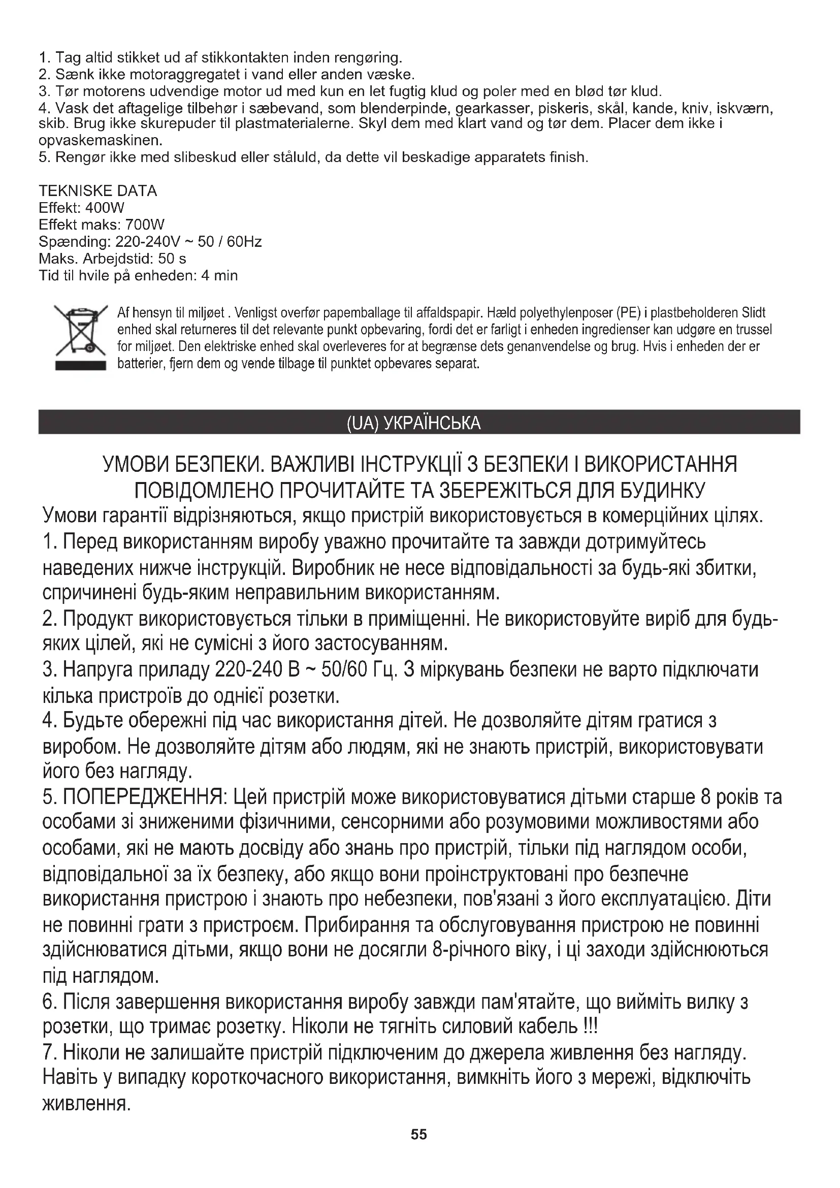 Час до відпочинку пристрою: 4 хв У інтересах навколишнього середовища. Будь ласка, віддайте картонну упаковку в місце збору мукулатури. Політиленові мішки (PE) викинути в смітник для пластику. Відпрацьований пристрій повинен бути відправлений у відповідну точку зберігання, тому що в пристрої є небезпечні інгредієнти, які можуть становити загрозу навколишньому середовищу. Електричний пристрій потрібно повернути так, щоб обмежити його повторне використання. Якщо у пристрої є батерейки, то потрібно їх витягнути і віддати до відповідного пунтку. (SR) СРПСКИ