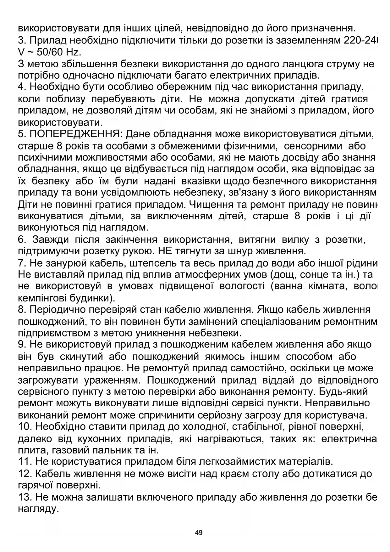 старше 8 років та особами з обмеженими фізичними, сенсорними або психічними можливостями або особами, які не мають досвіду або знання обладнання, якщо це відбувається під наглядом особи, яка відповідає за їх безпеку або їм були надані вказівки щодо безпечного використання приладу та вони усвідомлюють небезпеку, зв'язану з його використанням. Діти не повинні гратися приладом. Чищення та ремонт приладу не повинні виконуватися дітьми, за виключенням дітей, старше 8 років і ці дії виконуються під наглядом. використовувати для інших цілей, невідповідно до його призначення.
