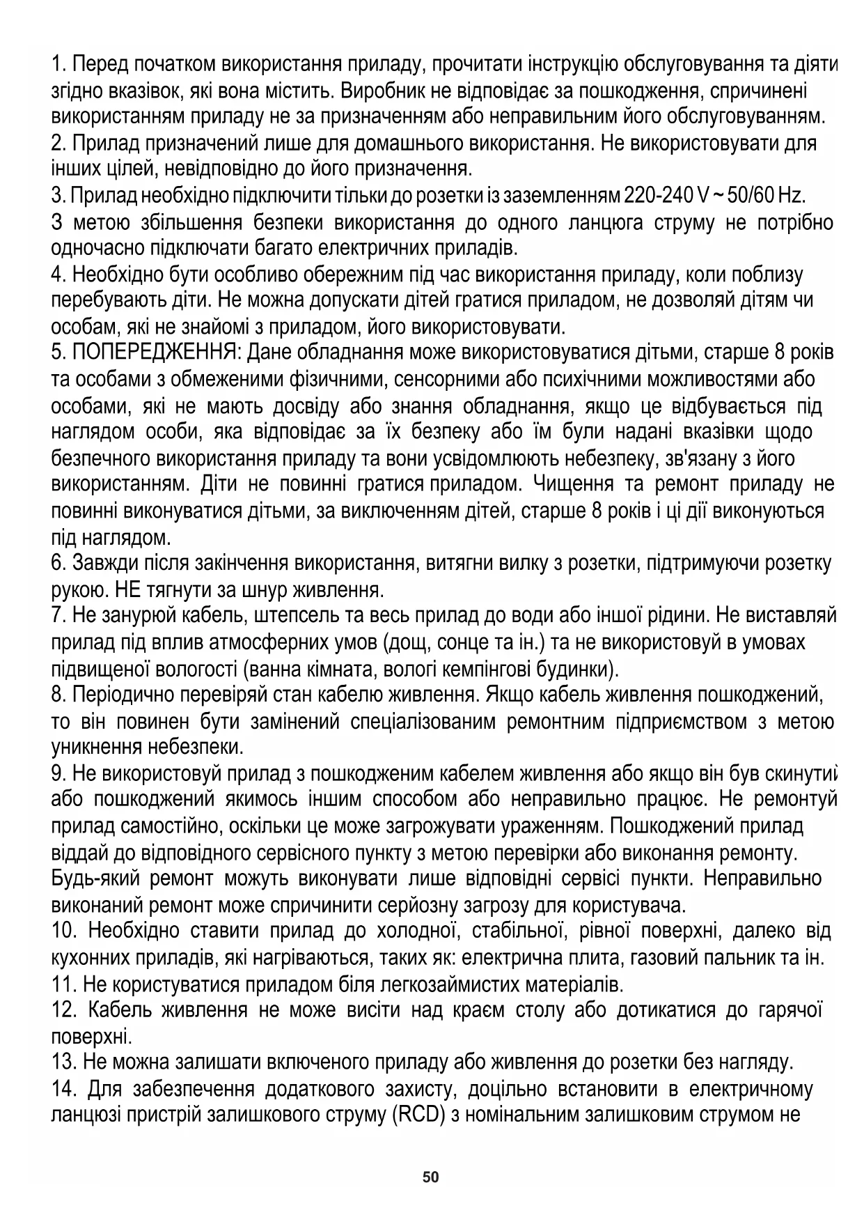 3. Прилад необхідно підключити тільки до розетки із заземленням 220-240 V ~ 50/60 Hz.51