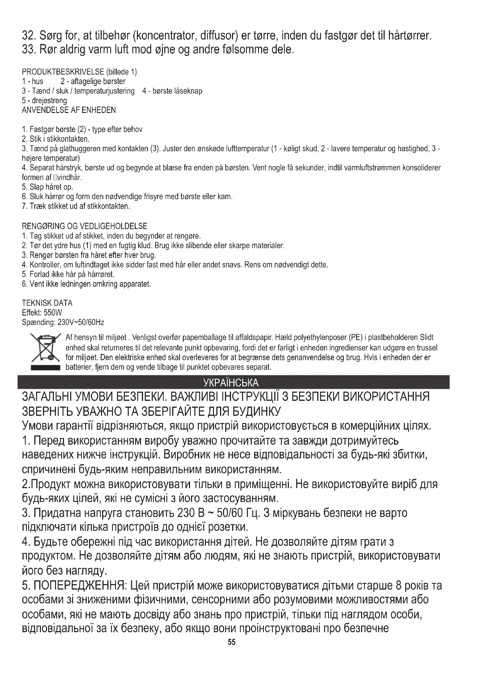 ТЕХНІЧНІ ДАНІ Потужність: 550Вт Напруга: 230B ~50/60Hz У інтересах навколишнього середовища. Будь ласка, віддайте картонну упаковку в місце збору мукулатури. Політиленові мішки (PE) викинути в смітник для пластику. Відпрацьований пристрій повинен бути відправлений у відповідну точку зберігання, тому що в пристрої є небезпечні інгредієнти, які можуть становити загрозу навколишньому середовищу. Електричний пристрій потрібно повернути так, щоб обмежити його повторне використання. Якщо у пристрої є батерейки, то потрібно їх витягнути і віддати до відповідного пунтку. 57فﻠﺗﺧﺗ طورﺷ نﺎﻣﺿﻟا اذإ مﺗ مادﺧﺗﺳا زﺎﮭﺟﻟا ضارﻏﻷ ﺔﯾرﺎﺟﺗ.