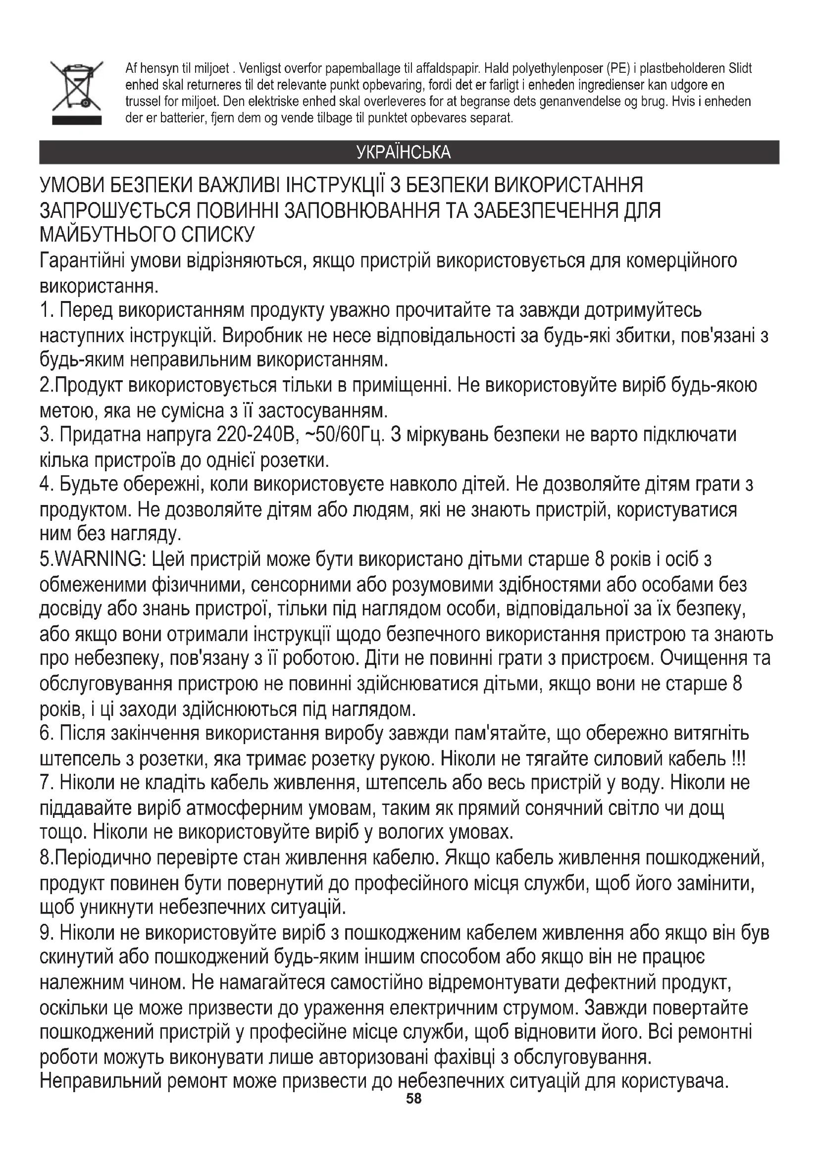 продуктом. Не дозволяйте дітям або людям, які не знають пристрій, користуватися ним без нагляду. 5.WARNING: Цей пристрій може бути використано дітьми старше 8 років і осіб з обмеженими фізичними, сенсорними або розумовими здібностями або особами без досвіду або знань пристрої, тільки під наглядом особи, відповідальної за їх безпеку, або якщо вони отримали інструкції щодо безпечного використання пристрою та знають про небезпеку, пов'язану з її роботою. Діти не повинні грати з пристроєм. Очищення та обслуговування пристрою не повинні здійснюватися дітьми, якщо вони не старше 8 років, і ці заходи здійснюються під наглядом.