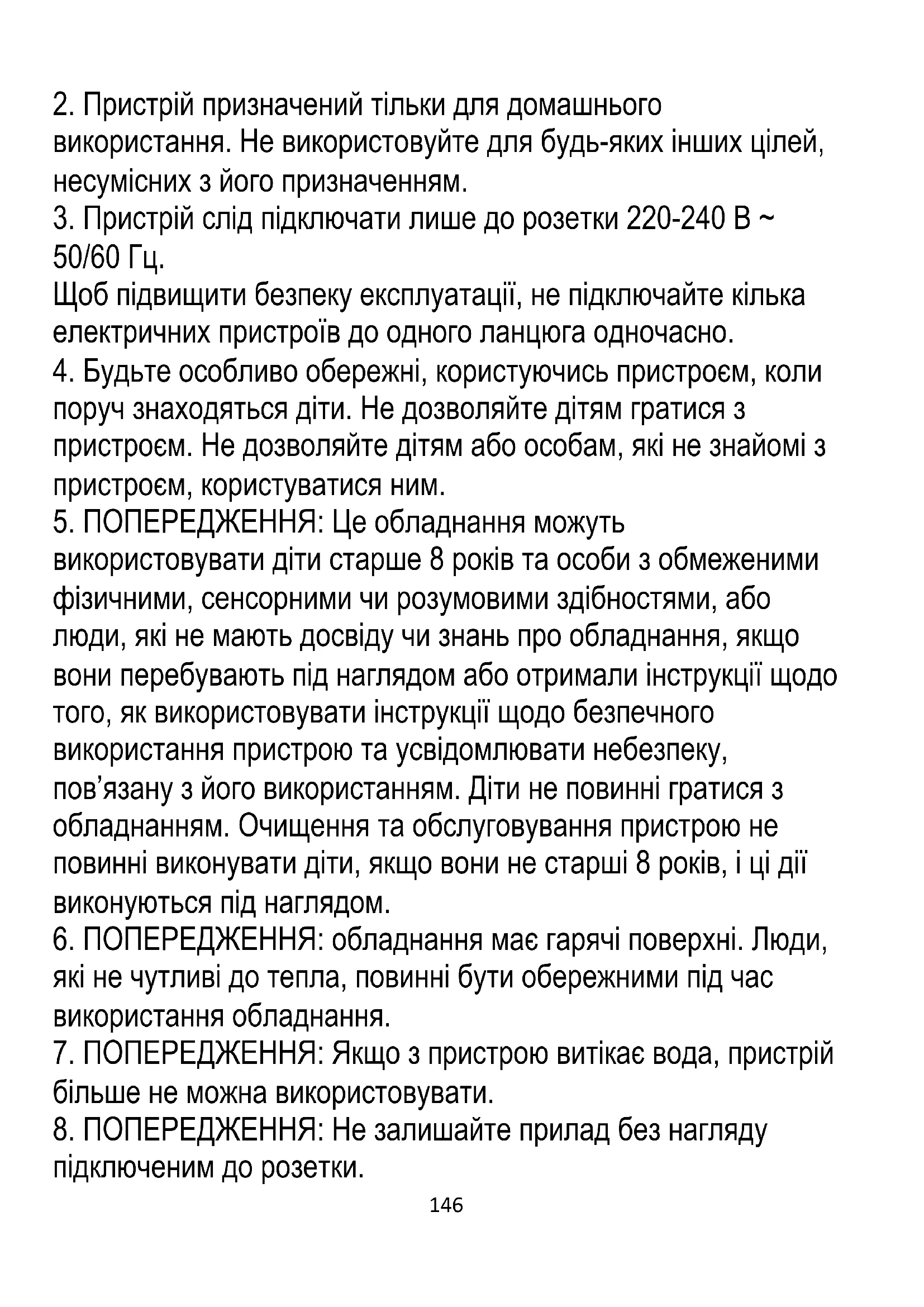 використовувати діти старше 8 років та особи з обмеженими фізичними, сенсорними чи розумовими здібностями, або люди, які не мають досвіду чи знань про обладнання, якщо вони перебувають під наглядом або отримали інструкції щодо того, як використовувати інструкції щодо безпечного використання пристрою та усвідомлювати небезпеку, пов’язану з його використанням. Діти не повинні гратися з обладнанням. Очищення та обслуговування пристрою не повинні виконувати діти, якщо вони не старші 8 років, і ці дії виконуються під наглядом.