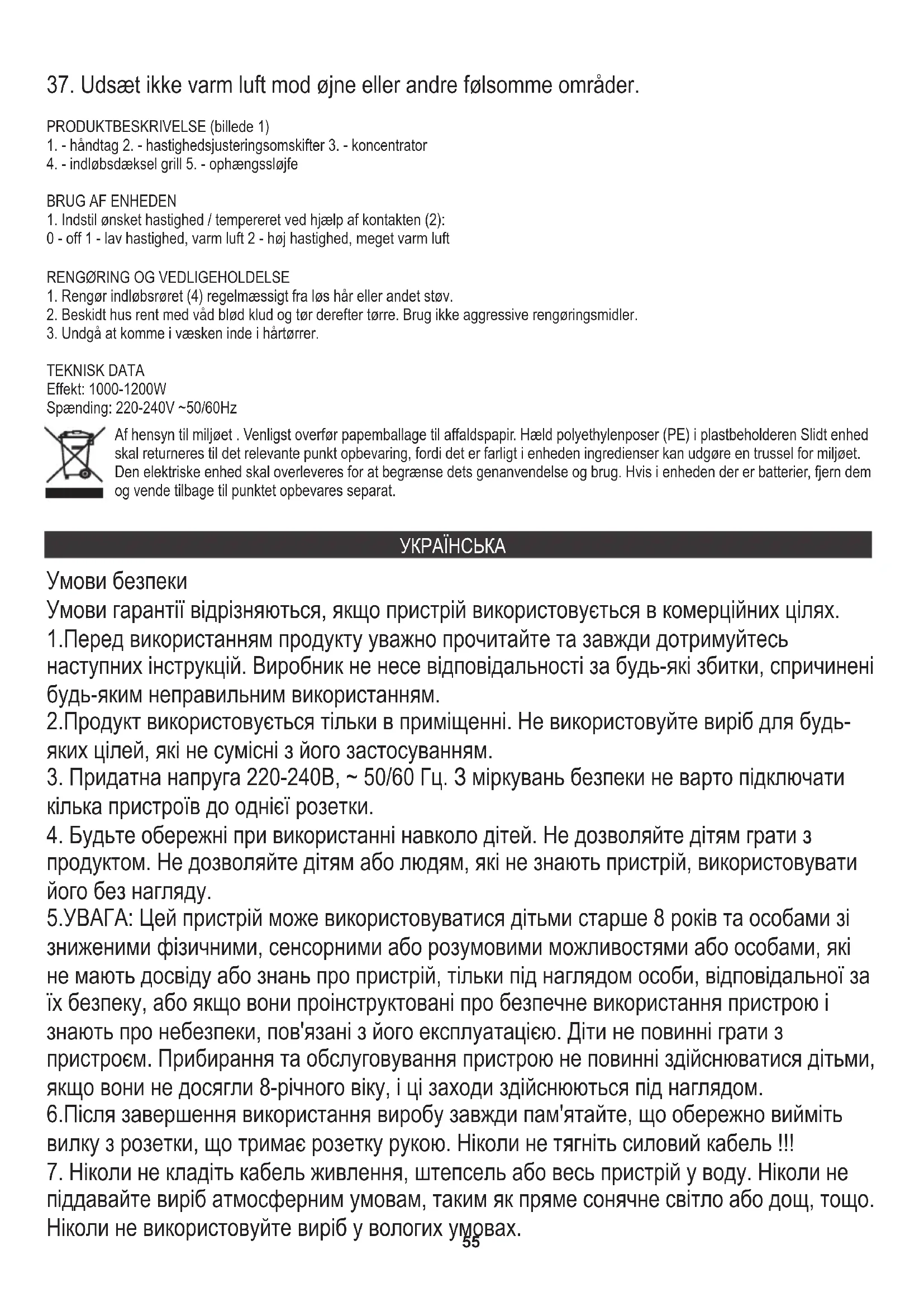 38. Не направляйте гаряче повітря на очі або інші чутливі області.