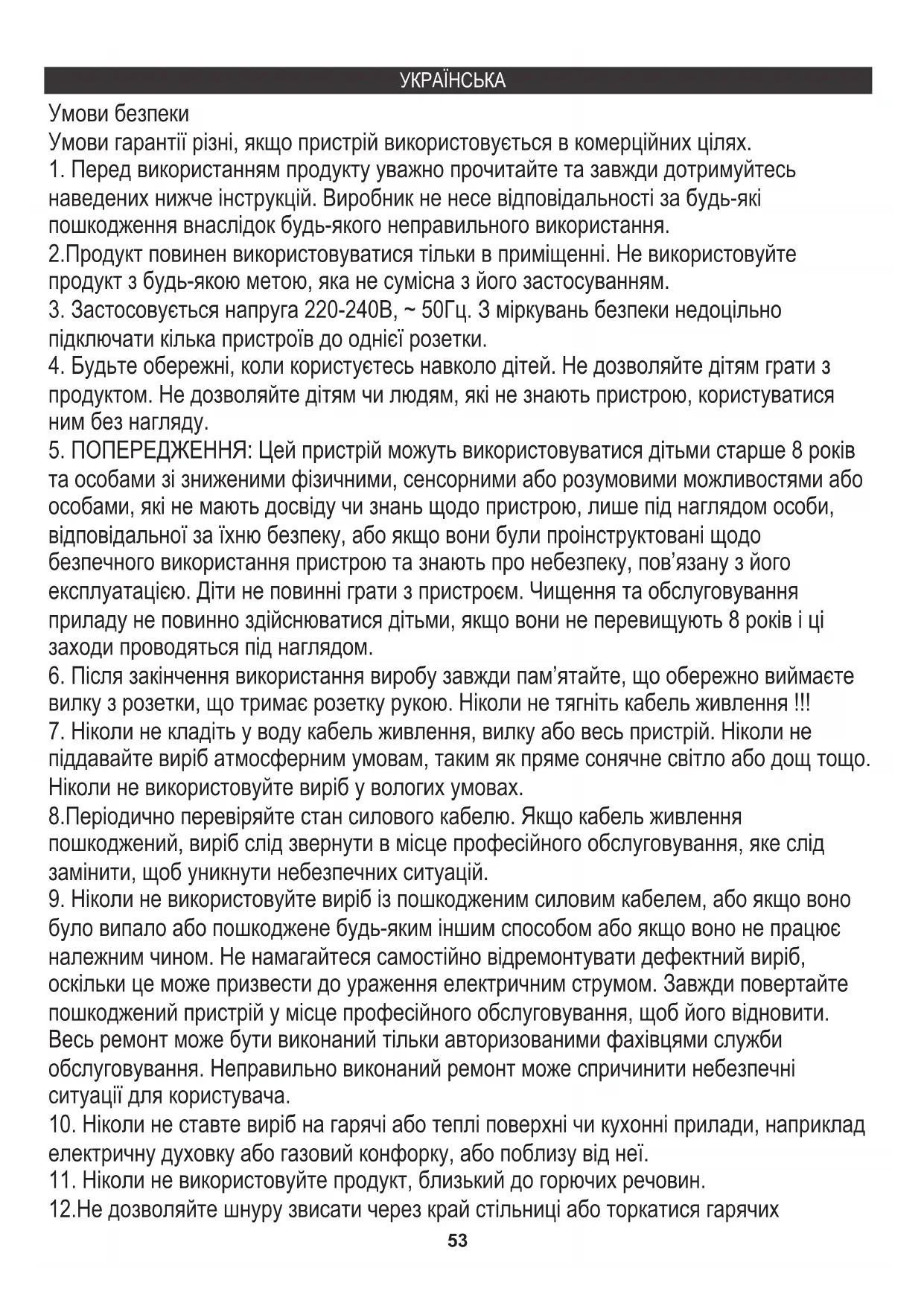 вилку з розетки, що тримає розетку рукою. Ніколи не тягніть кабель живлення !!! 12.Не дозволяйте шнуру звисати через край стільниці або торкатися гарячих54