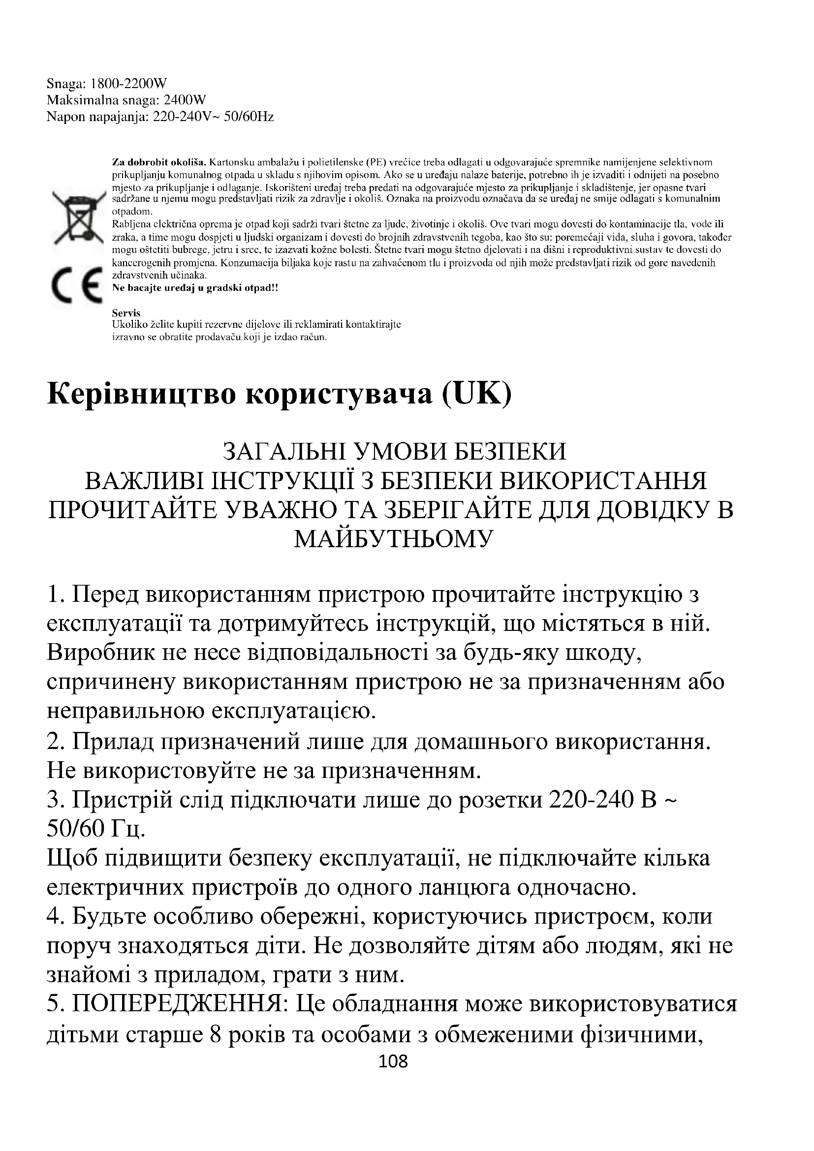 Якщо ви бажаєте придбати запчастини або зробити рекламацію, звертайтесь зверніться безпосередньо до продавця, який видав чек. Упутство за употребу (SR) ОПШТИ УСЛОВИ БЕЗБЕДНОСТИ ВАЖНА БЕЗБЕДНОСНА УПУТСТВА ЗА УПОТРЕБУ ПАЖЉИВО ПРОЧИТАЈТЕ И ЗАЧУВАЈТЕ ЗА БУДУЋЕ РЕФЕРЕНЦЕ113