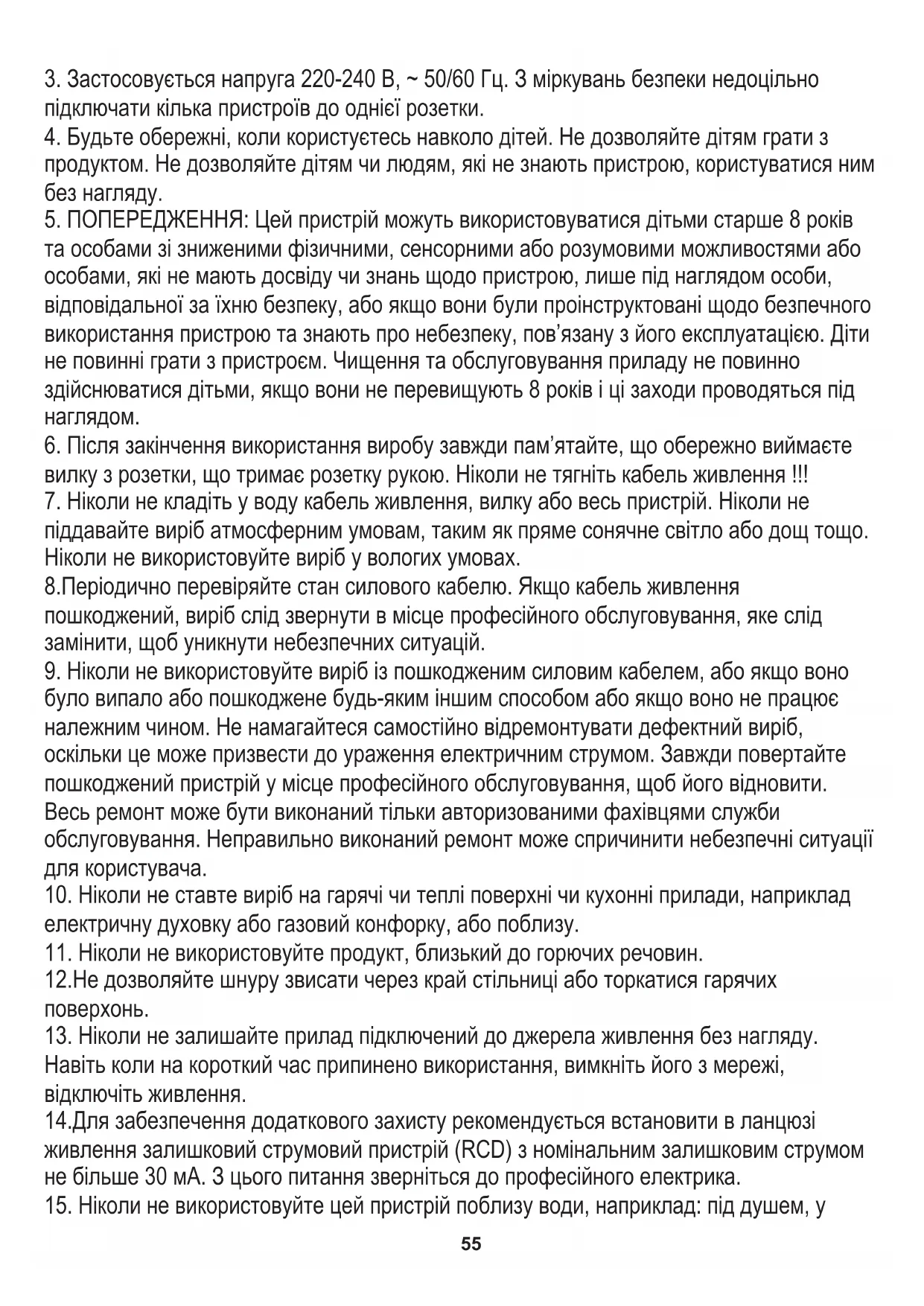 Навіть коли на короткий час припинено використання, вимкніть його з мережі, відключіть живлення. 14.Для забезпечення додаткового захисту рекомендується встановити в ланцюзі живлення залишковий струмовий пристрій (RCD) з номінальним залишковим струмом не більше 30 мА. З цього питання зверніться до професійного електрика.