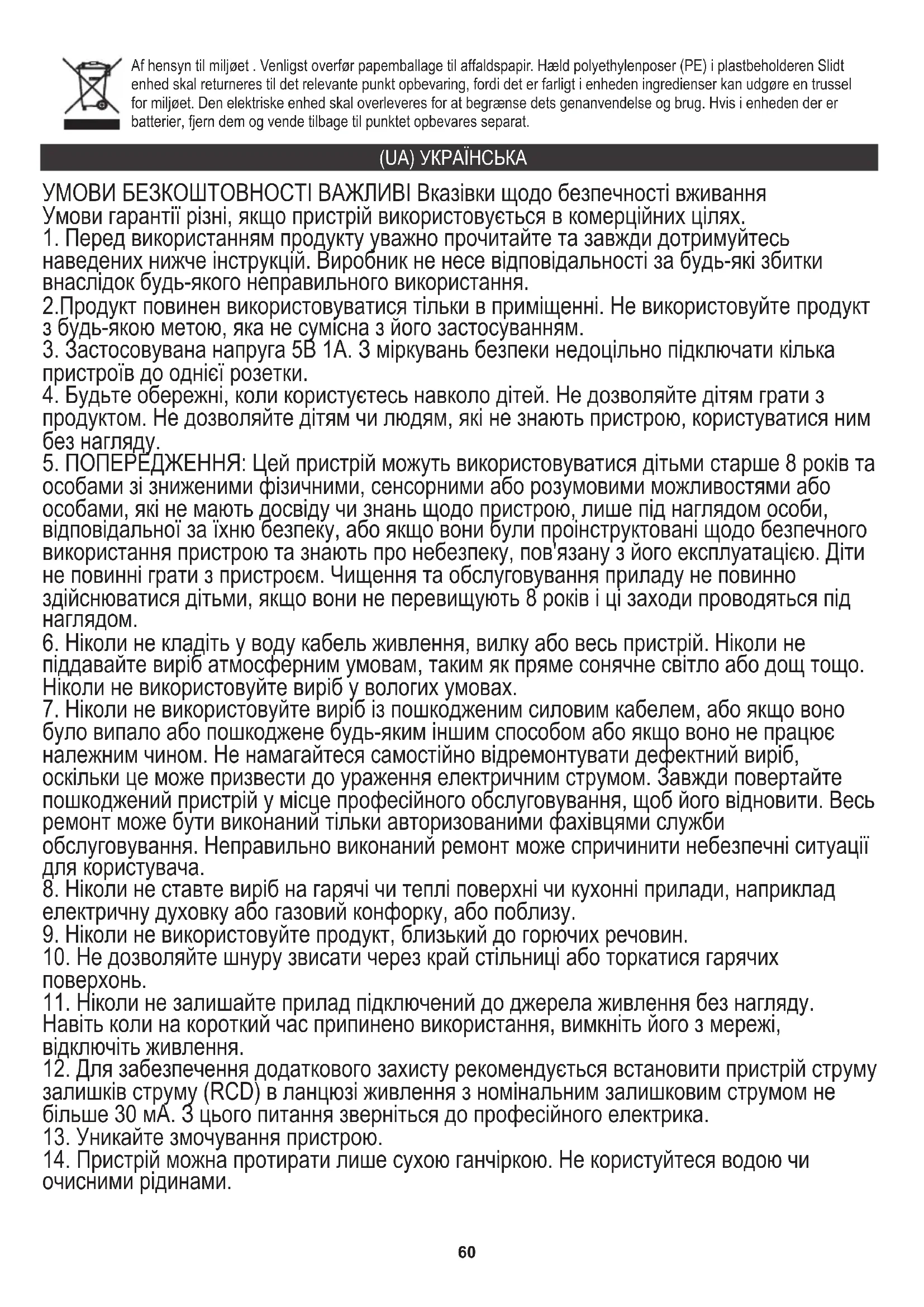 очисними рідинами. Af hensyn til miljøet . Venligst overfør papemballage til affaldspapir. Hæld polyethylenposer (PE) i plastbeholderen Slidt enhed skal returneres til det relevante punkt opbevaring, fordi det er farligt i enheden ingredienser kan udgøre en trussel for miljøet. Den elektriske enhed skal overleveres for at begrænse dets genanvendelse og brug. Hvis i enheden der er batterier, fjern dem og vende tilbage til punktet opbevares separat.61