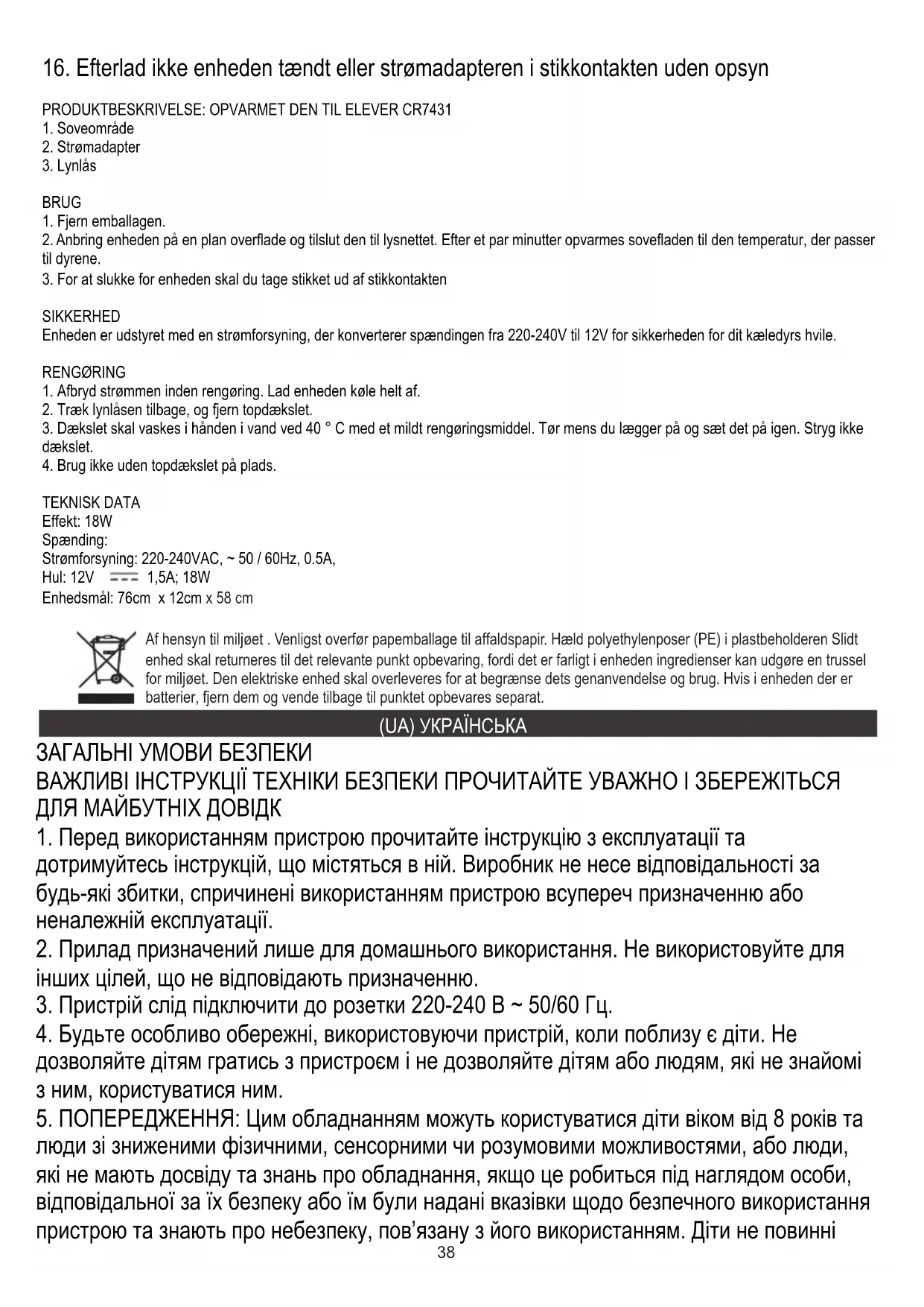 Живлення: 220-240 В змінного струму, ~ 50/60 Гц, 0,5 А, День: 12V 1,5A; 18 Вт Розміри пристрою: 76 х 12см x 58 cm40 У інтересах навколишнього середовища. Будь ласка, віддайте картонну упаковку в місце збору мукулатури. Політиленові мішки (PE) викинути в смітник для пластику. Відпрацьований пристрій повинен бути відправлений у відповідну точку зберігання, тому що в пристрої є небезпечні інгредієнти, які можуть становити загрозу навколишньому середовищу. Електричний пристрій потрібно повернути так, щоб обмежити його повторне використання. Якщо у пристрої є батерейки, то потрібно їх витягнути і віддати до відповідного пунтку.
