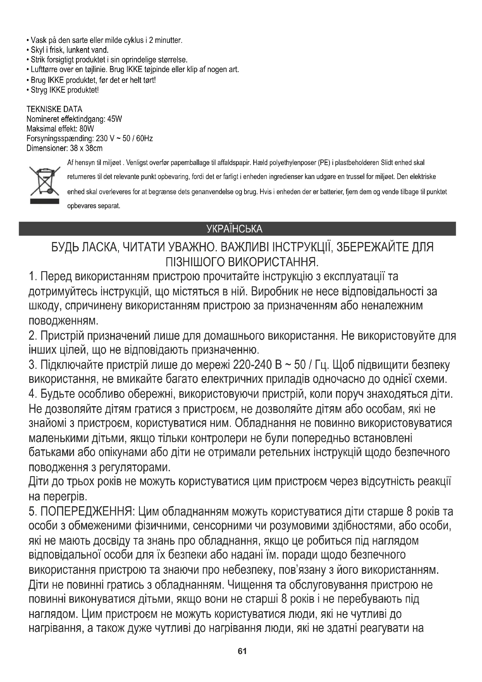 особи з обмеженими фізичними, сенсорними чи розумовими здібностями, або особи, які не мають досвіду та знань про обладнання, якщо це робиться під наглядом відповідальної особи для їх безпеки або надані їм. поради щодо безпечного використання пристрою та знаючи про небезпеку, пов’язану з його використанням. Діти не повинні гратись з обладнанням. Чищення та обслуговування пристрою не повинні виконуватися дітьми, якщо вони не старші 8 років і не перебувають під наглядом. Цим пристроєм не можуть користуватися люди, які не чутливі до нагрівання, а також дуже чутливі до нагрівання люди, які не здатні реагувати на62 перегрів, а також люди, які потребують постійного догляду.