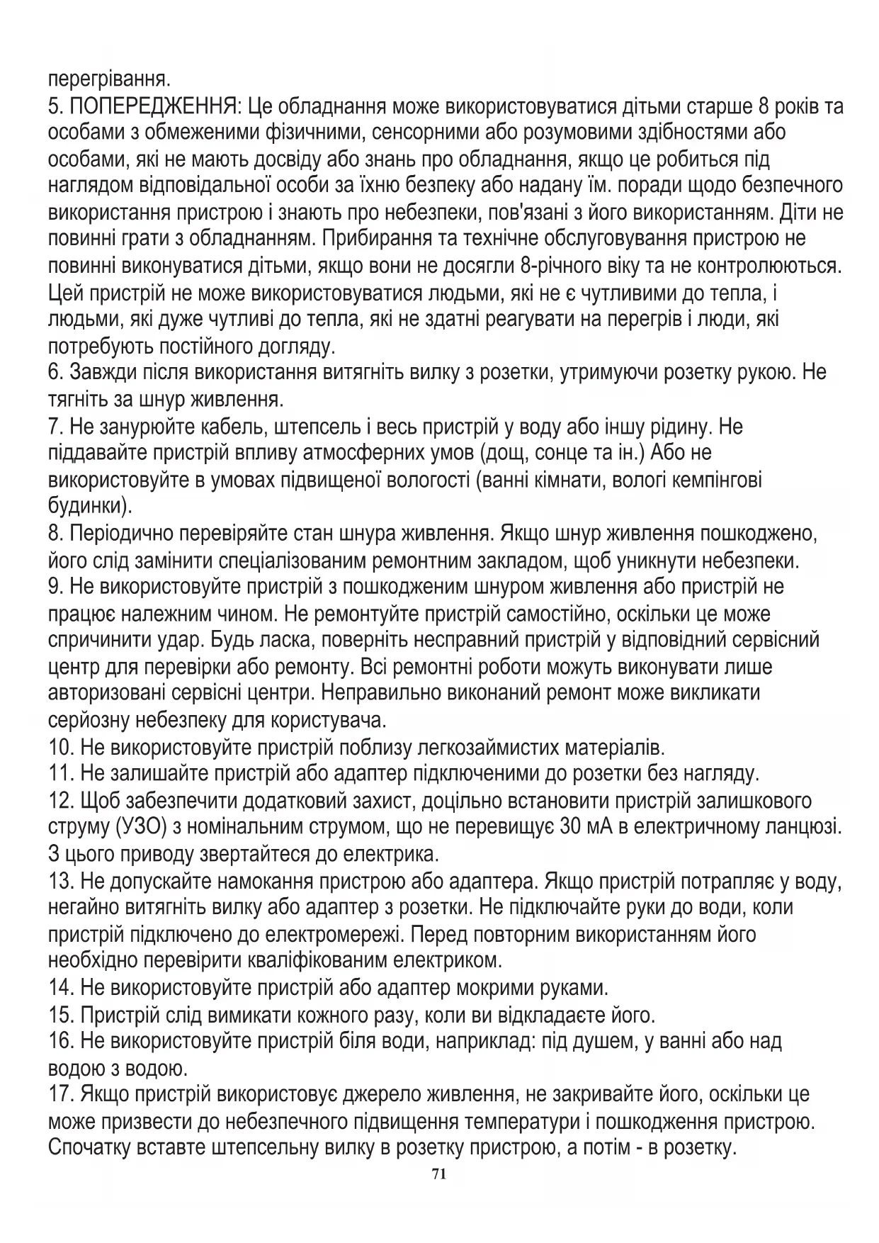 7. Не занурюйте кабель, штепсель і весь пристрій у воду або іншу рідину. Не