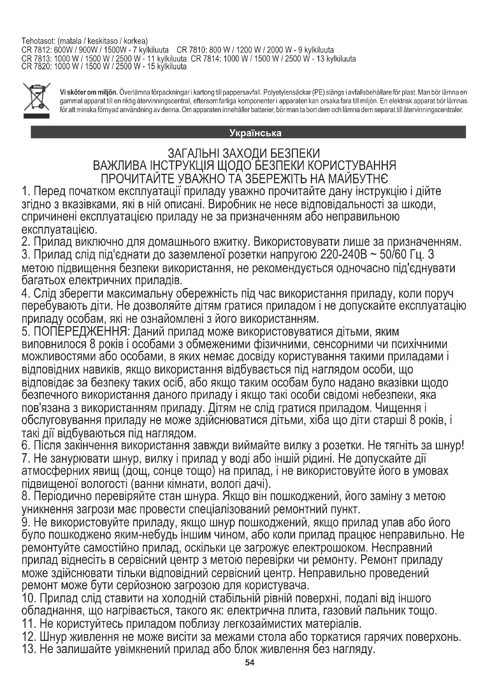 Вони можуть реагувати на пристрій та спричинити зміну кольору або навіть пошкодження. ТЕХНІЧНІ ДАНІ Джерело живлення: 220-240 В ~ 50/60 Гц Рівні потужності: (низький / середній / високий) CR 7812: 600 Вт / 900 Вт / 1500 Вт - 7 ребер CR 7810: 800 Вт / 1200 Вт / 2000 Вт - 9 ребер CR 7813: 1000 Вт / 1500 Вт / 2500 Вт - 11 ребер CR 7814: 1000 Вт / 1500 Вт / 2500 Вт - 13 ребер CR 7820: 1000 Вт / 1500 Вт / 2500 Вт - 15 ребер Svenska У інтересах навколишнього середовища. Будь ласка, віддайте картонну упаковку в місце збору мукулатури. Політиленові мішки (PE) викинути в смітник для пластику. Відпрацьований пристрій повинен бути відправлений у відповідну точку зберігання, тому що в пристрої є небезпечні інгредієнти, які можуть становити загрозу навколишньому середовищу. Електричний пристрій потрібно повернути так, щоб обмежити його повторне використання. Якщо у пристрої є батерейки, то потрібно їх витягнути і віддати до відповідного пунтку.