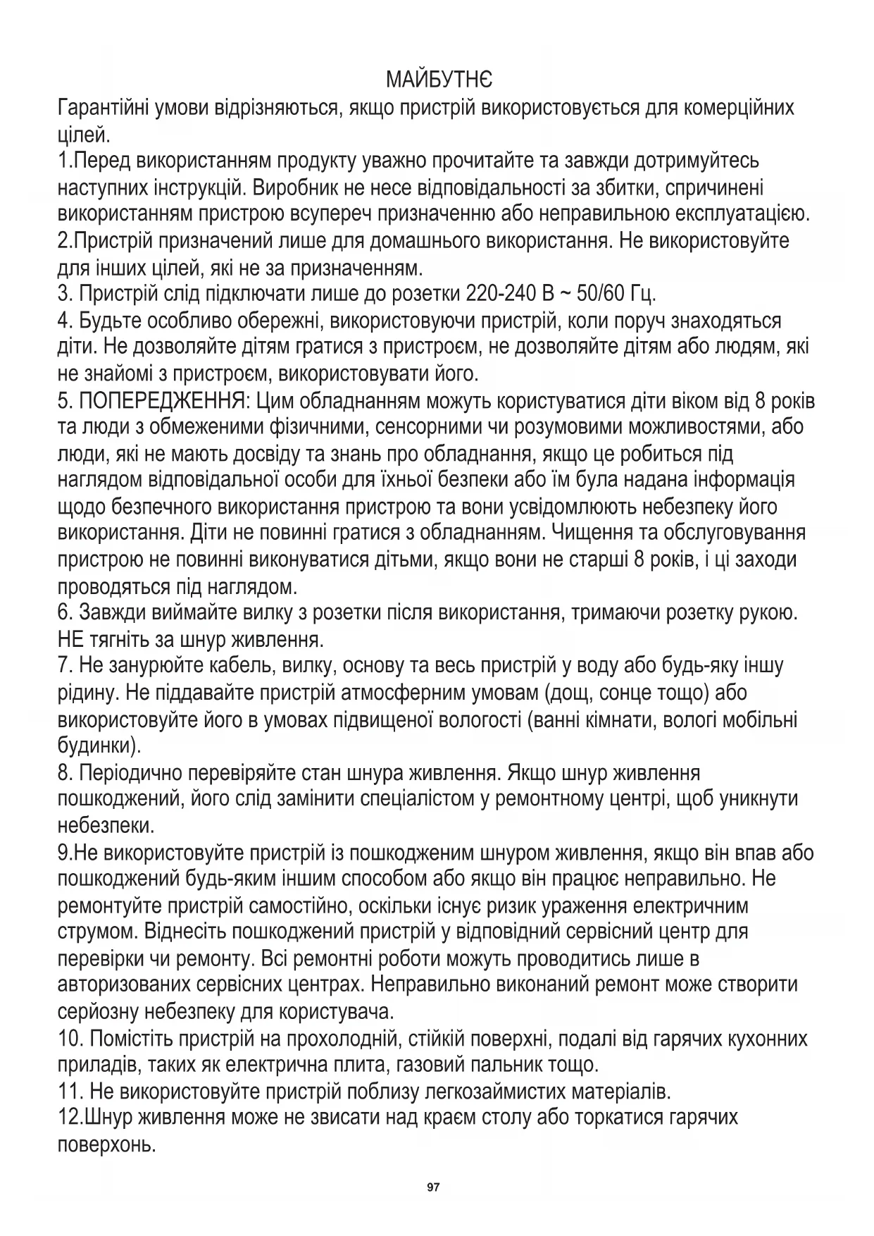 9.Не використовуйте пристрій із пошкодженим шнуром живлення, якщо він впав або пошкоджений будь-яким іншим способом або якщо він працює неправильно. Не ремонтуйте пристрій самостійно, оскільки існує ризик ураження електричним струмом. Віднесіть пошкоджений пристрій у відповідний сервісний центр для перевірки чи ремонту. Всі ремонтні роботи можуть проводитись лише в авторизованих сервісних центрах. Неправильно виконаний ремонт може створити серйозну небезпеку для користувача.