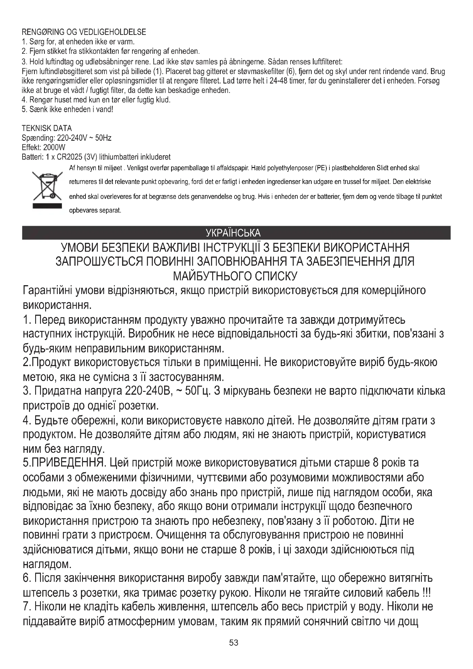 ТЕХНІЧНІ ДАНІ Напруга: 220-240В ~ 50Гц Потужність: 2000Вт Акумулятор: 1 x CR2025 (3V) літієва батарея У інтересах навколишнього середовища. Будь ласка, віддайте картонну упаковку в місце збору мукулатури. Політиленові мішки (PE) викинути в смітник для пластику. Відпрацьований пристрій повинен бути відправлений у відповідну точку зберігання, тому що в пристрої є небезпечні інгредієнти, які можуть становити загрозу навколишньому середовищу. Електричний пристрій потрібно повернути так, щоб обмежити його повторне використання. Якщо у пристрої є батерейки, то потрібно їх витягнути і віддати до відповідного пунтку.