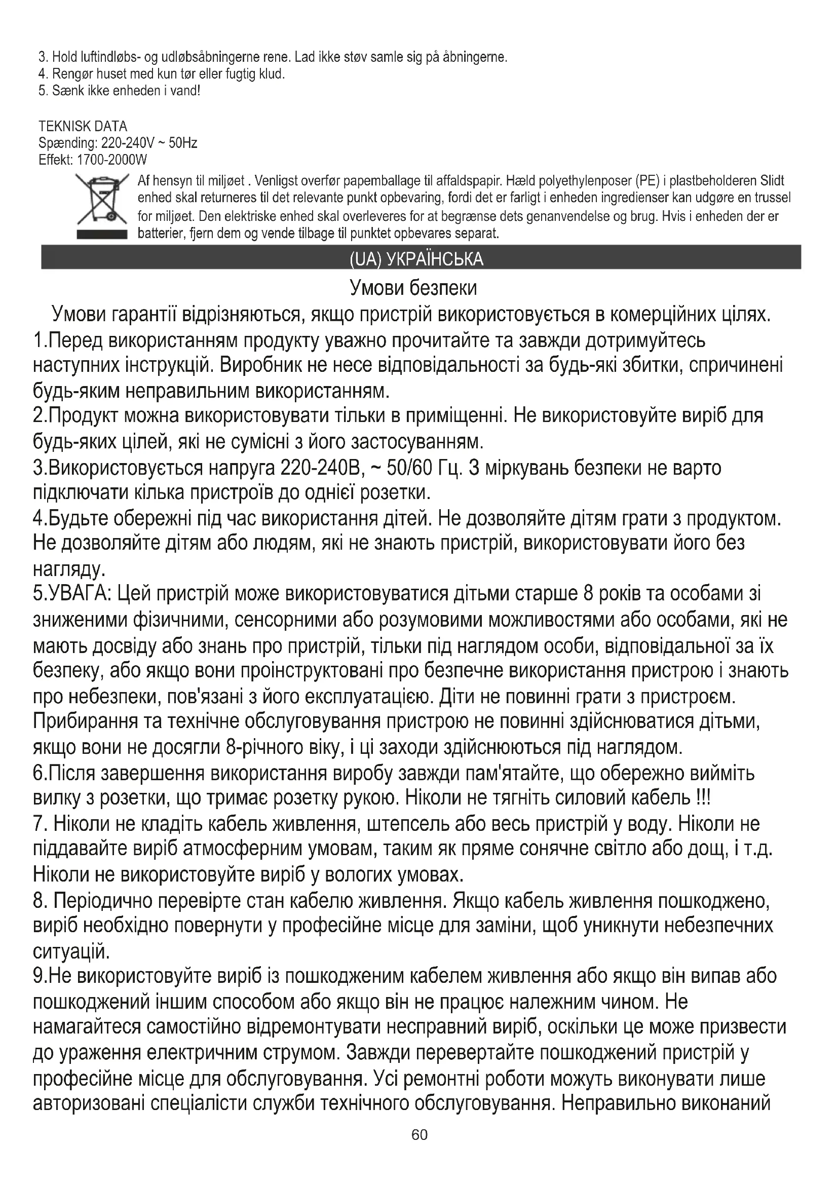 Af hensyn til miljøet . Venligst overfør papemballage til affaldspapir. Hæld polyethylenposer (PE) i plastbeholderen Slidt enhed skal returneres til det relevante punkt opbevaring, fordi det er farligt i enheden ingredienser kan udgøre en trussel for miljøet. Den elektriske enhed skal overleveres for at begrænse dets genanvendelse og brug. Hvis i enheden der er batterier, fjern dem og vende tilbage til punktet opbevares separat. (UA) УКРАЇНСЬКА Умови безпеки Умови гарантії відрізняються, якщо пристрій використовується в комерційних цілях. 1.Перед використанням продукту уважно прочитайте та завжди дотримуйтесь наступних інструкцій. Виробник не несе відповідальності за будь-які збитки, спричинені будь-яким неправильним використанням. 2.Продукт можна використовувати тільки в приміщенні. Не використовуйте виріб для будь-яких цілей, які не сумісні з його застосуванням. 3.Використовується напруга 220-240В, ~ 50/60 Гц. З міркувань безпеки не варто підключати кілька пристроїв до однієї розетки. 4.Будьте обережні під час використання дітей. Не дозволяйте дітям грати з продуктом. Не дозволяйте дітям або людям, які не знають пристрій, використовувати його без