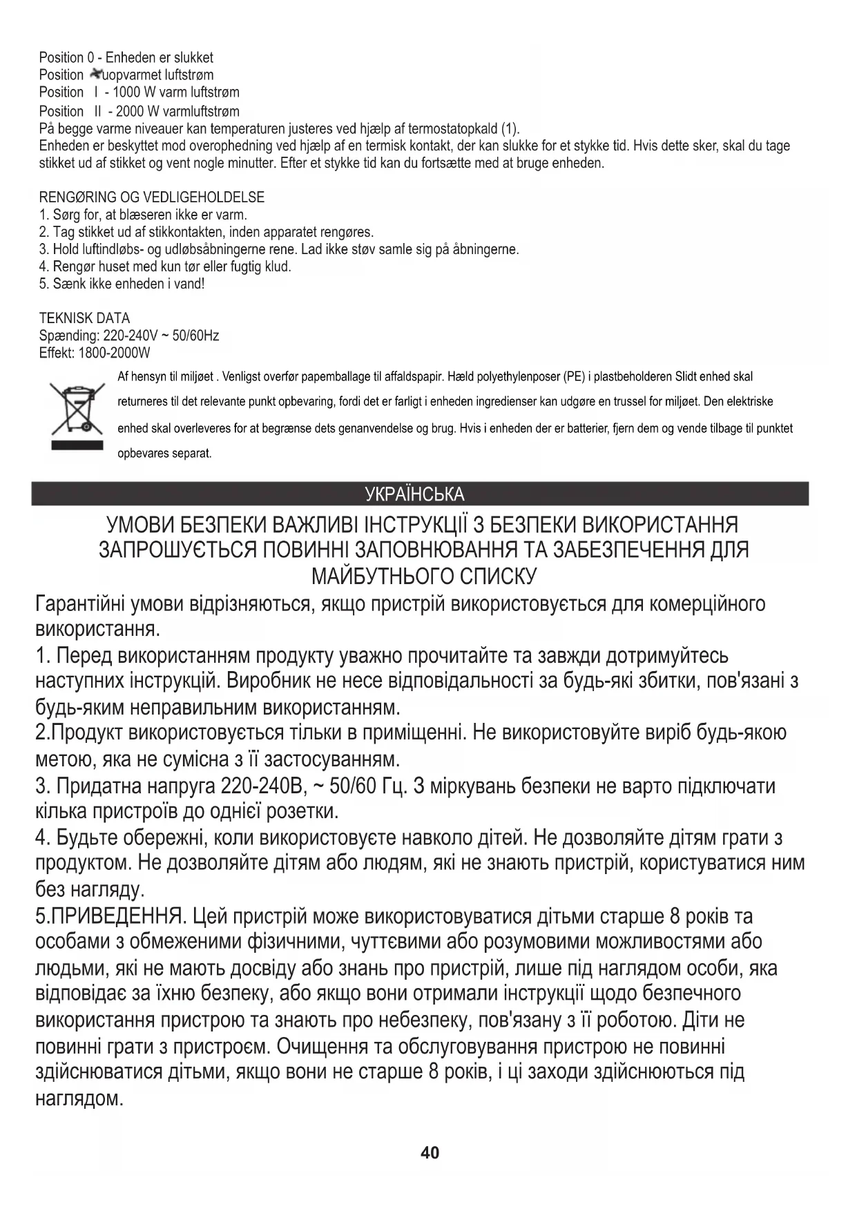 наступних інструкцій. Виробник не несе відповідальності за будь-які збитки, пов'язані з будь-яким неправильним використанням. 5.ПРИВЕДЕННЯ. Цей пристрій може використовуватися дітьми старше 8 років та особами з обмеженими фізичними, чуттєвими або розумовими можливостями або людьми, які не мають досвіду або знань про пристрій, лише під наглядом особи, яка відповідає за їхню безпеку, або якщо вони отримали інструкції щодо безпечного використання пристрою та знають про небезпеку, пов'язану з її роботою. Діти не повинні грати з пристроєм. Очищення та обслуговування пристрою не повинні здійснюватися дітьми, якщо вони не старше 8 років, і ці заходи здійснюються під
