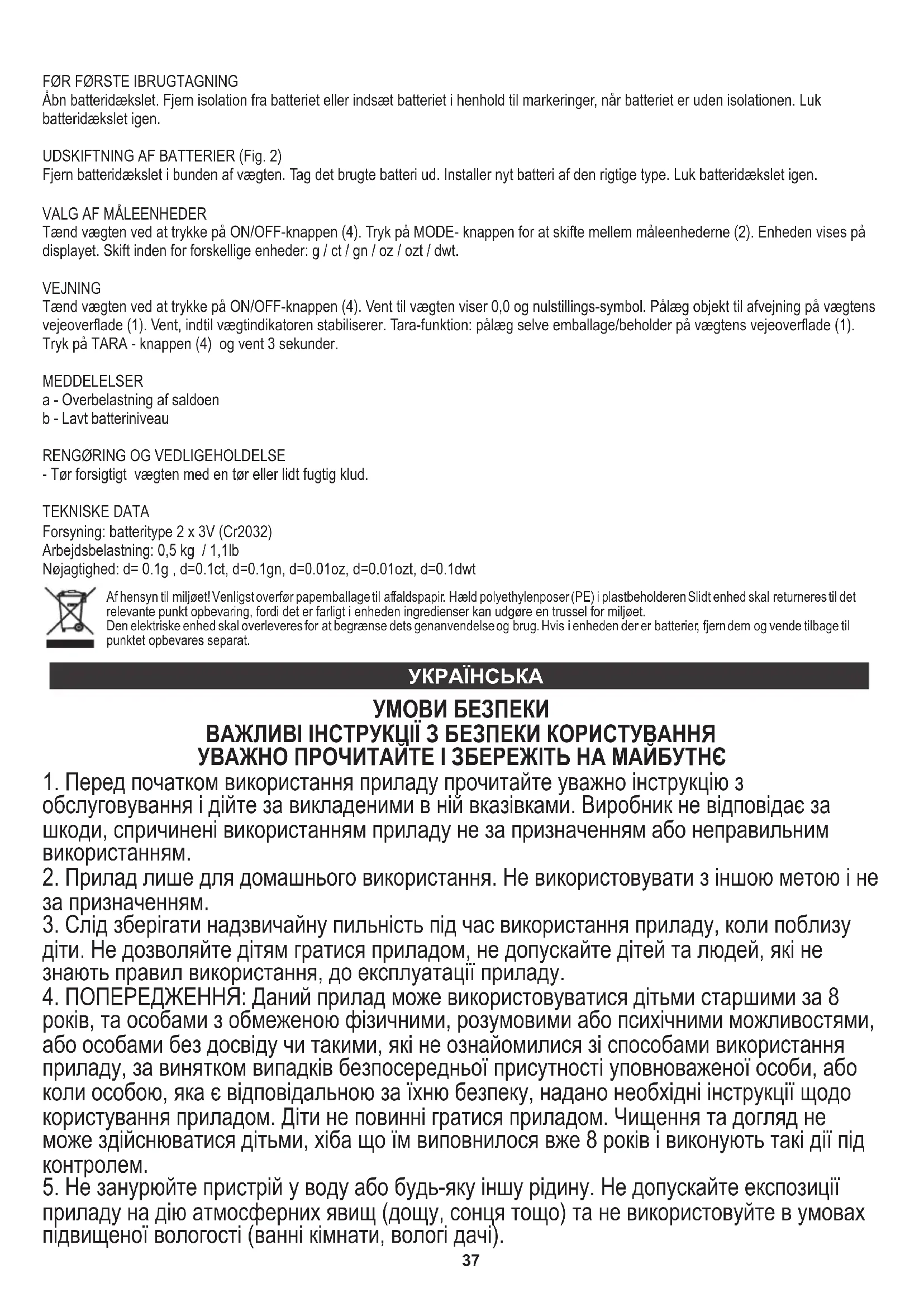 Перед першим використанням: ТЕХНІЧНІ ДАНІ У інтересах навколишнього середовища. Будь ласка, віддайте картонну упаковку в місце збору мукулатури. Політиленові мішки (PE) викинути в смітник для пластику. можуть становити загрозу навколишньому середовищу. Електричний пристрій потрібно повернути так, щоб обмежити його повторне використання. Якщо у пристрої є батерейки, то потрібно їх витягнути і віддати до відповідного пунтку. Відпрацьований пристрій повинен бути відправлений у відповідну точку зберігання, тому що в пристрої є небезпечні інгредієнти, які39