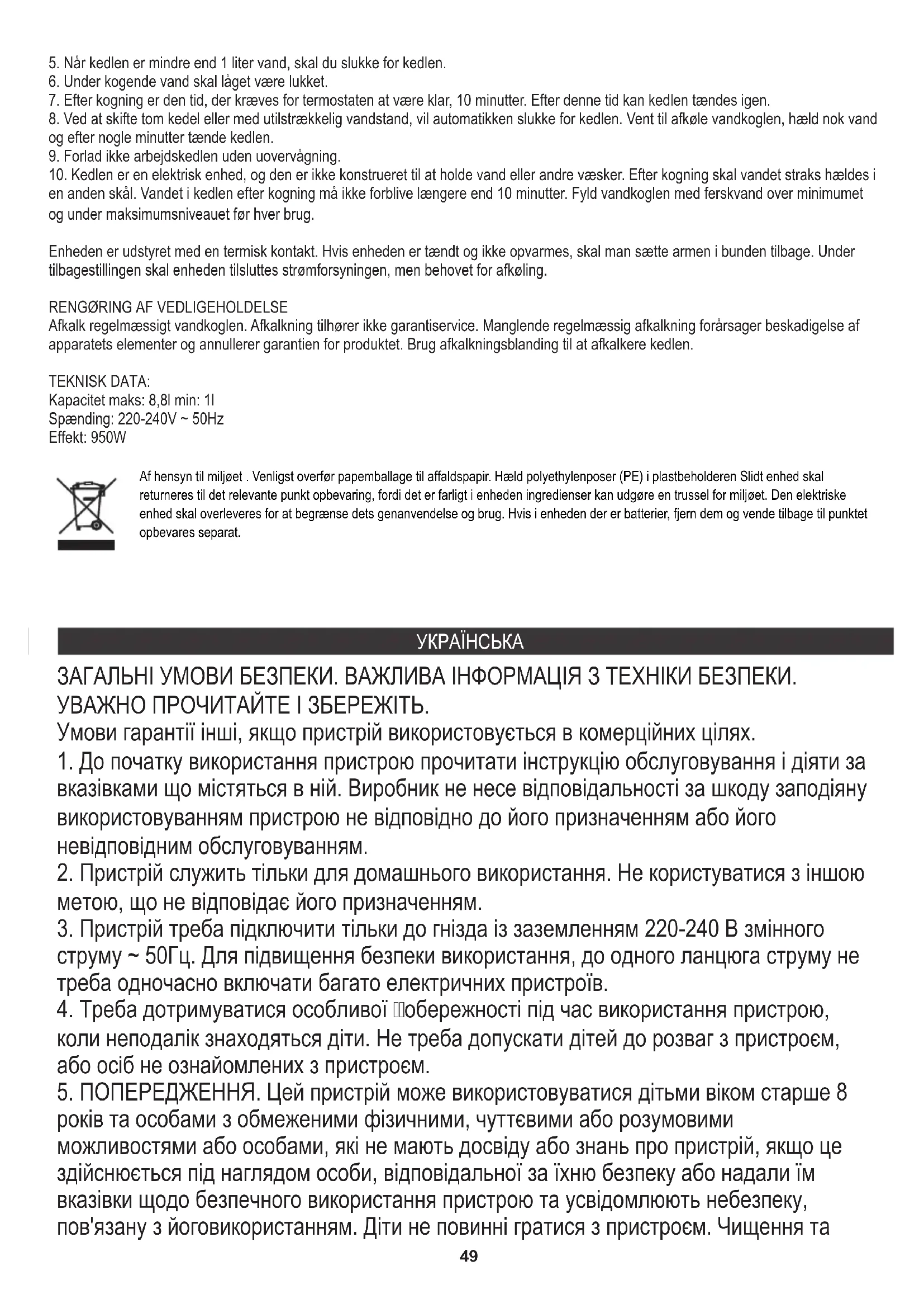 засобів. Використання приладу з накипом на нагріваючому елементі може його пошкодити та призвести до втрати гарантії. підтримка пристрою не повиннa здійснюватися дітьми, якщо вони не старше 8 років і підлягають нагляду.