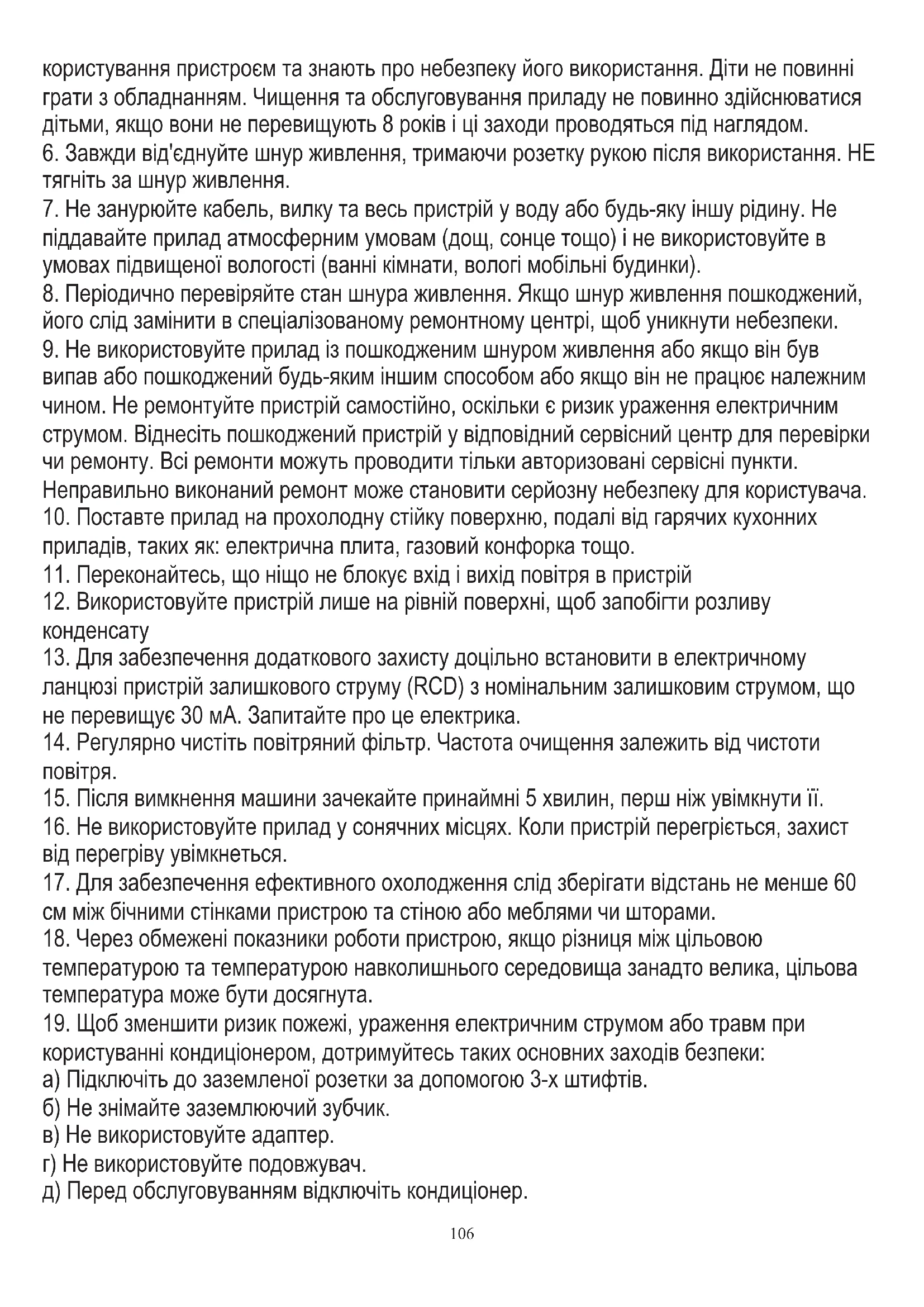користуванні кондиціонером, дотримуйтесь таких основних заходів безпеки: в) Не використовуйте адаптер.