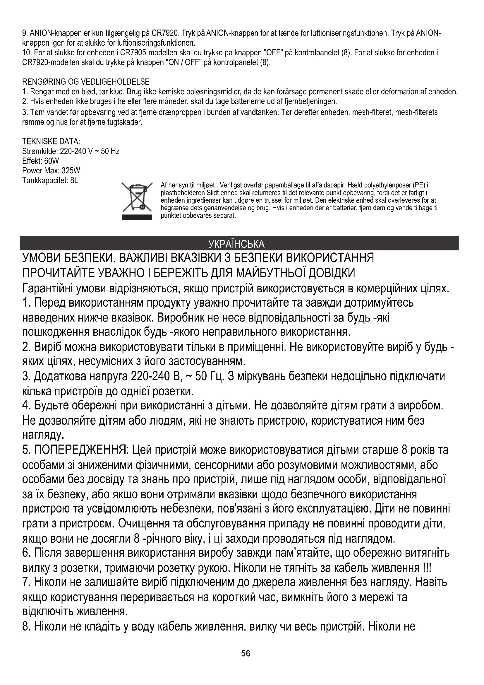 - ПОПЕРЕДЖЕННЯ: Якщо воду не замінюють, а резервуар не очищається належним чином кожні 3 дні, мікроорганізми, які можуть бути присутніми у воді або в середовищі, де пристрій використовується або зберігається, можуть розвинутися у резервуарі для води і видутися до оточення. Це може спричинити дуже серйозний ризик для здоров'я.58 10. Щоб вимкнути пристрій у моделі CR7905, натисніть кнопку «OFF» на панелі керування (8). Щоб вимкнути пристрій у моделі CR7920, натисніть кнопку «ON / OFF» на панелі керування (8).